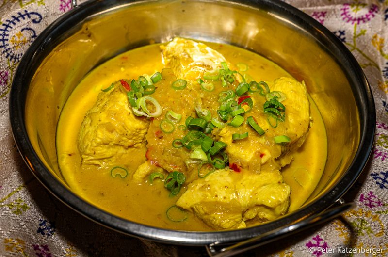 Das indonesische Gericht „Ajam Besengeh“, Hühnchen in gelber Kokosnuss-Sauce, schmeckt äußerst aromatisch und würzig und duftet verführerisch.