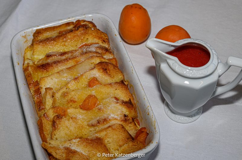 Ein Scheiterhaufen mit Aprikosen, mit den Resten eines Hefekranzes, schmeckt köstlich. Das Erdbeermark dazu ist die Krönung.