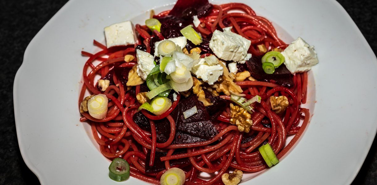 Die Rote-Bete-Spaghetti überzeugen durch ihre satte rote Farbe. Aber der Geschmack ist sensationell: erdig, frisch, nussig und schließlich pikant durch den Schafskäse.