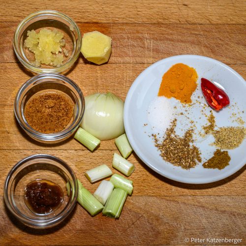 - Alle Zutaten für die Gewürzpaste mit einem Multizerkleinerer zu einer Paste mixen. Immer wieder die Zutaten vom Rand in Richtung Schneiderblatt streifen.