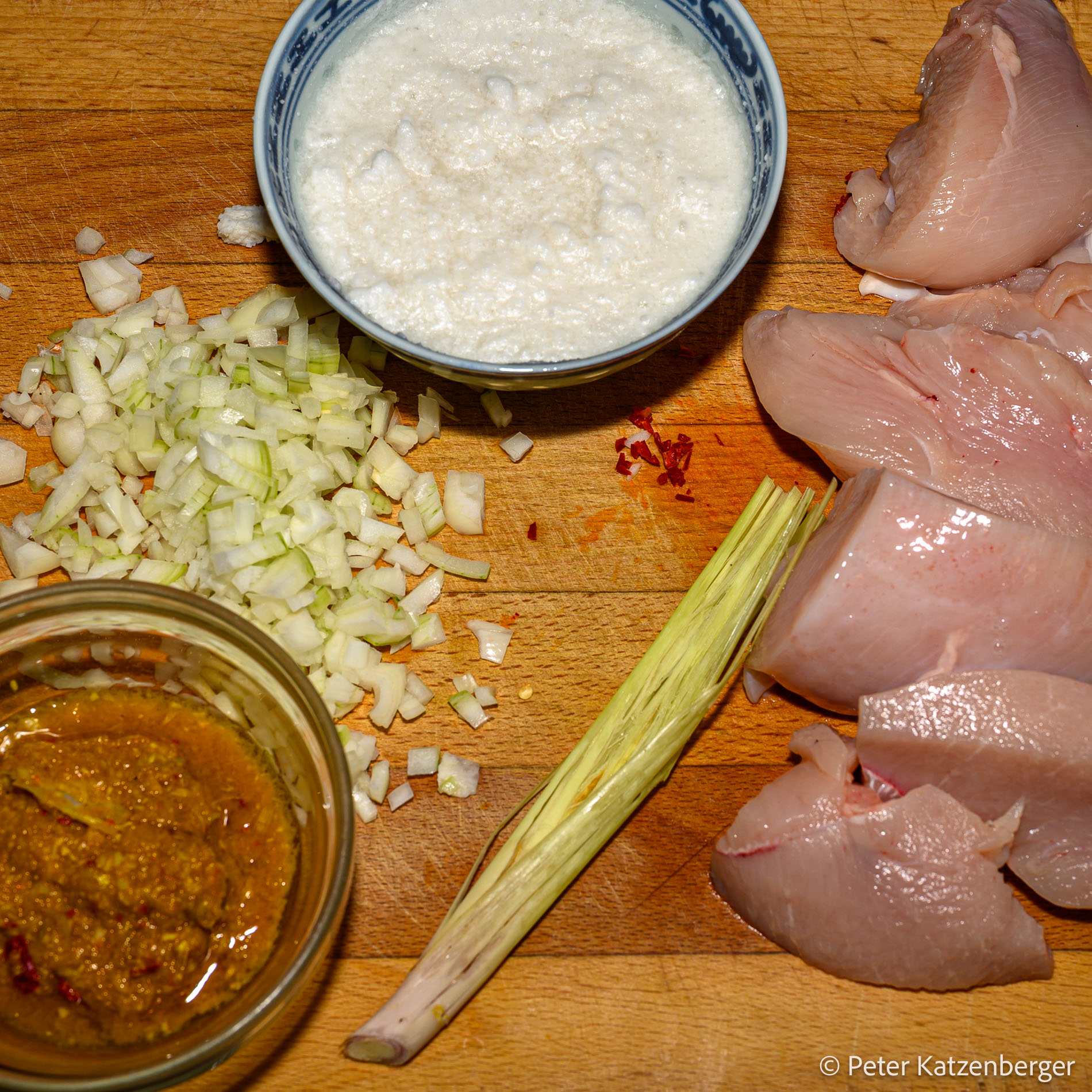 - Gebt in einem Wok bei mittlerer bis hoher Hitze 2 Esslöffel Kokosmilch. Die Sauce beginnt zu sprudeln, was normal ist, und wird anschließend klar. Nun fügt die Gewürzpaste hinzu und rührt sie solange, bis sie etwas angedickt ist (etwa 3 Minuten)Die gewürfelten Zwiebeln und Chilis hinzufügen. Unter ständigem Rühren ca. 2 Minuten braten, bis die Zwiebeln glasig sind.Das Hähnchen hinzufügen und ständig umrühren, damit es vollständig mit der Gewürzpaste bedeckt ist. Braten, bis das Hähnchen von allen Seiten angebraten ist. (Etwa 4–5 Minuten)Die Kokosmilch hinzufügen und umrühren, bis die Sauce gleichmäßig gelb ist.Das Zitronengras hinzufügen und vollständig bedecken. Dann die Hitze reduzieren und (unter gelegentlichem Rühren) köcheln lassen, bis das Hähnchen gar ist.Das Hähnchen aus der Pfanne nehmen und die Hitze erhöhen. Die Sauce um ein Drittel einkochen lassen.Sobald die Sauce eingekocht ist, das Hähnchen wieder hinzufügen und bei schwacher Hitze kurz anbraten, bis es warm ist und mit den dunklen Röllchen der Frühlingszwiebel bestreuen.