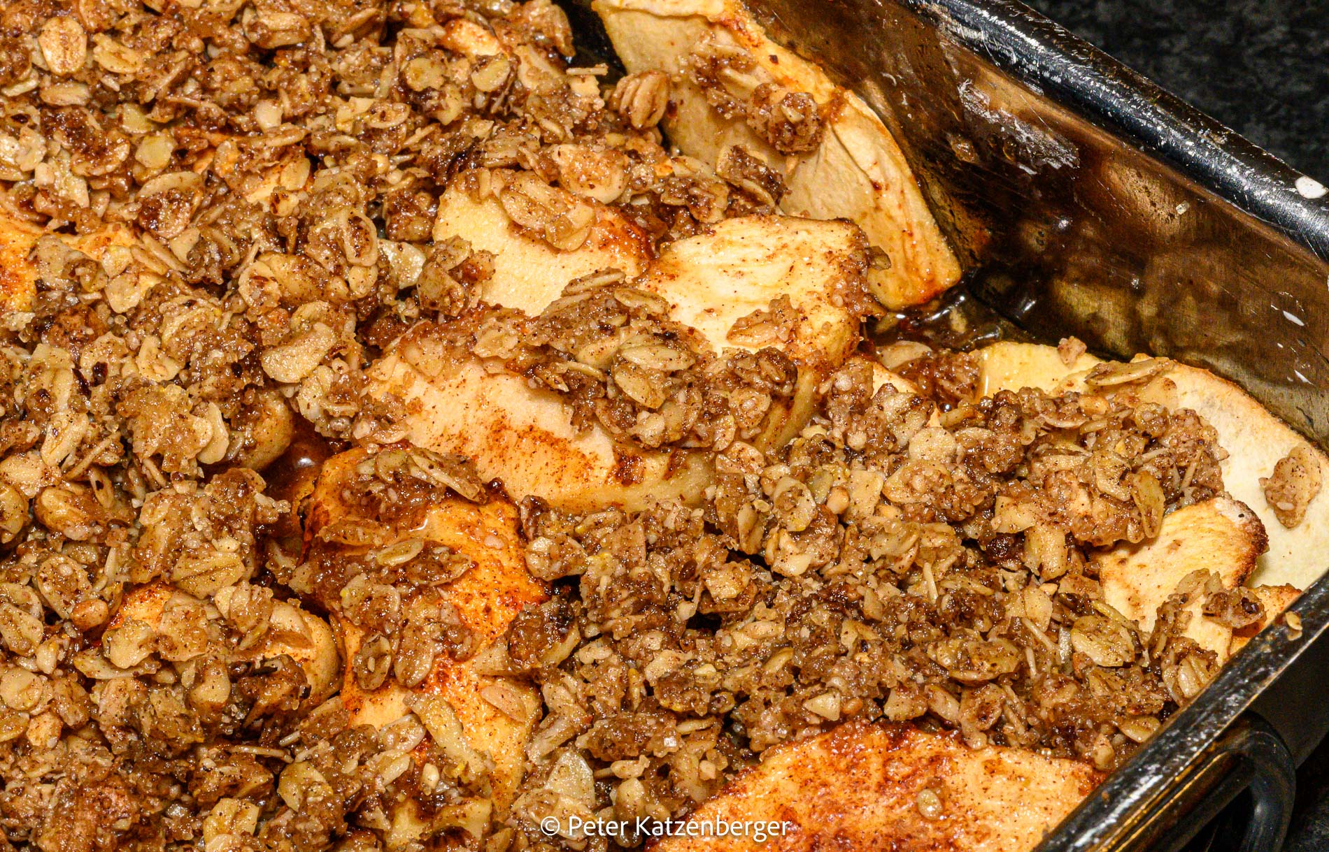 Was ist wohl der Unterschied zwischen Apple-Crumble und Apple Crisp, das fragte ich mich. Ich hatte in einem Buch von Apple Crisp gelesen und nach Rezepten gesucht. Auf dem Blog "Minimalist Baker" fand ich ein Rezept. Nun weiß ich, dass Apple Crisp normalerweise mit Haferflockenstreuseln gebacken wird und Crumble klassischerweise mit Teigstreuseln bestreut wird. Wenn der Duft von gebratenen Äpfeln und Zimt durch die Wohnung zieht, fühle ich mich wohl. Das vegane Apple Crisp Rezept von Minimalist Baker hat es mir angetan. Ob mir wohl die Butter fehlen wird? Bei allen meinen Apfelrezepten ist Butter als Geschmacksträgerin wichtig. Ich habe das Rezept etwas abgewandelt mit Zutaten, die ich immer im Haus habe. Außerdem war mir das Originalrezept zu süß.Den Apple Crisp servierte ich als Snack zu einem Spieleabend mit Freunden. Ich verschwieg, dass es ein rein veganes Rezept ist. Alle waren begeistert, besonders vom knusprigen Topping mit Haferflocken und Walnüssen und der karamellartigen Soße. Das Apple Crisp schmeckt so lecker, dass es in meine Standardrezeptsammlung Einzug finden wird. Ich bevorzuge für Apfelaufläufe besonders Boskop-Äpfel. Diese werden im Ofen besonders mürbe und der Geschmack ist unvergleichlich. Probiert aus, welche Sorte euch schmeckt.