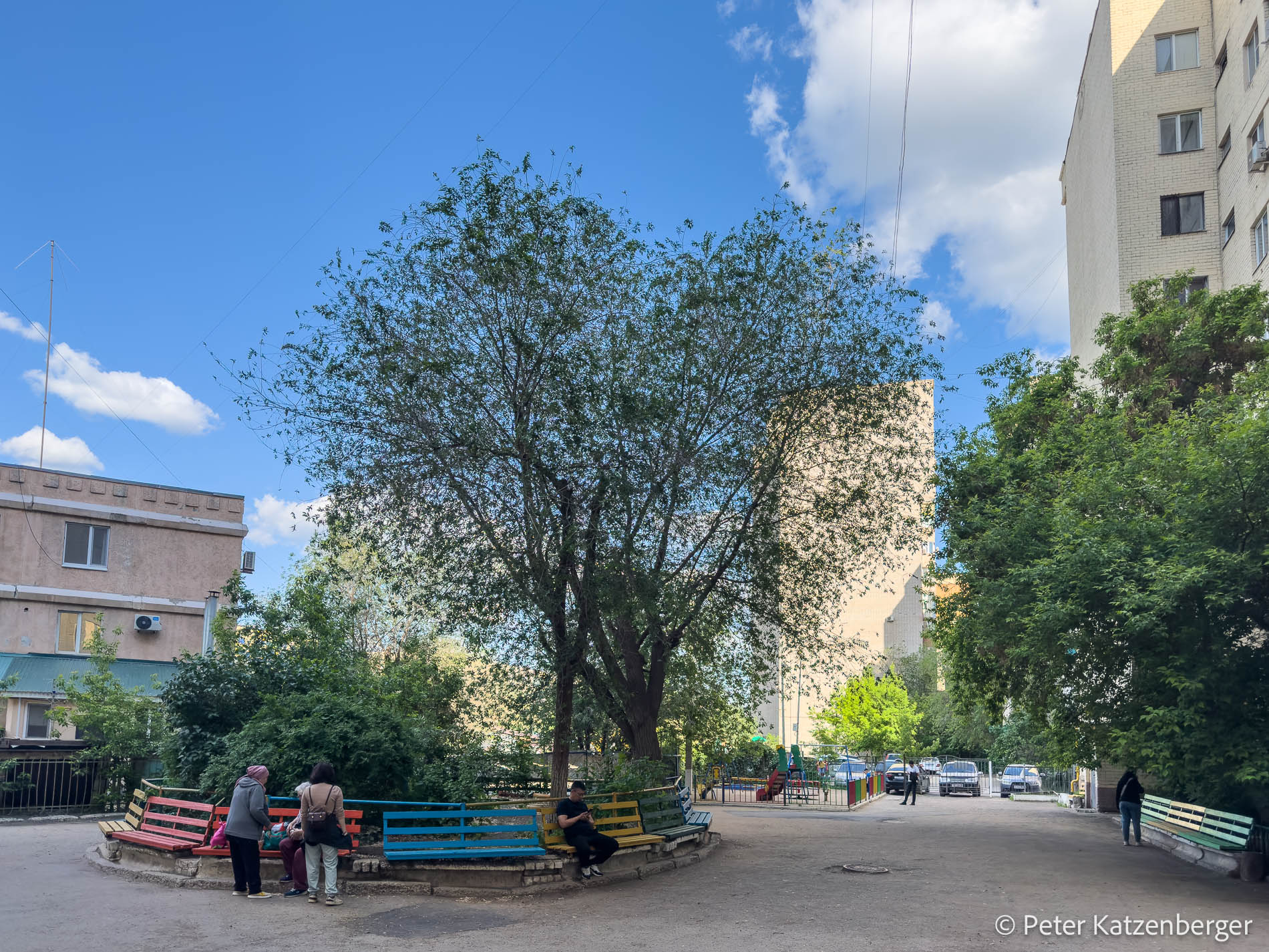 Den täglichen Weg zur Arbeit bei Jas Urpaq konnten wir bequem zu Fuß zurücklegen. Mit der Zeit entdecken wir einen Weg, der uns durch eine Allee, vorbei an einem kleinen Wochenmarkt führte.