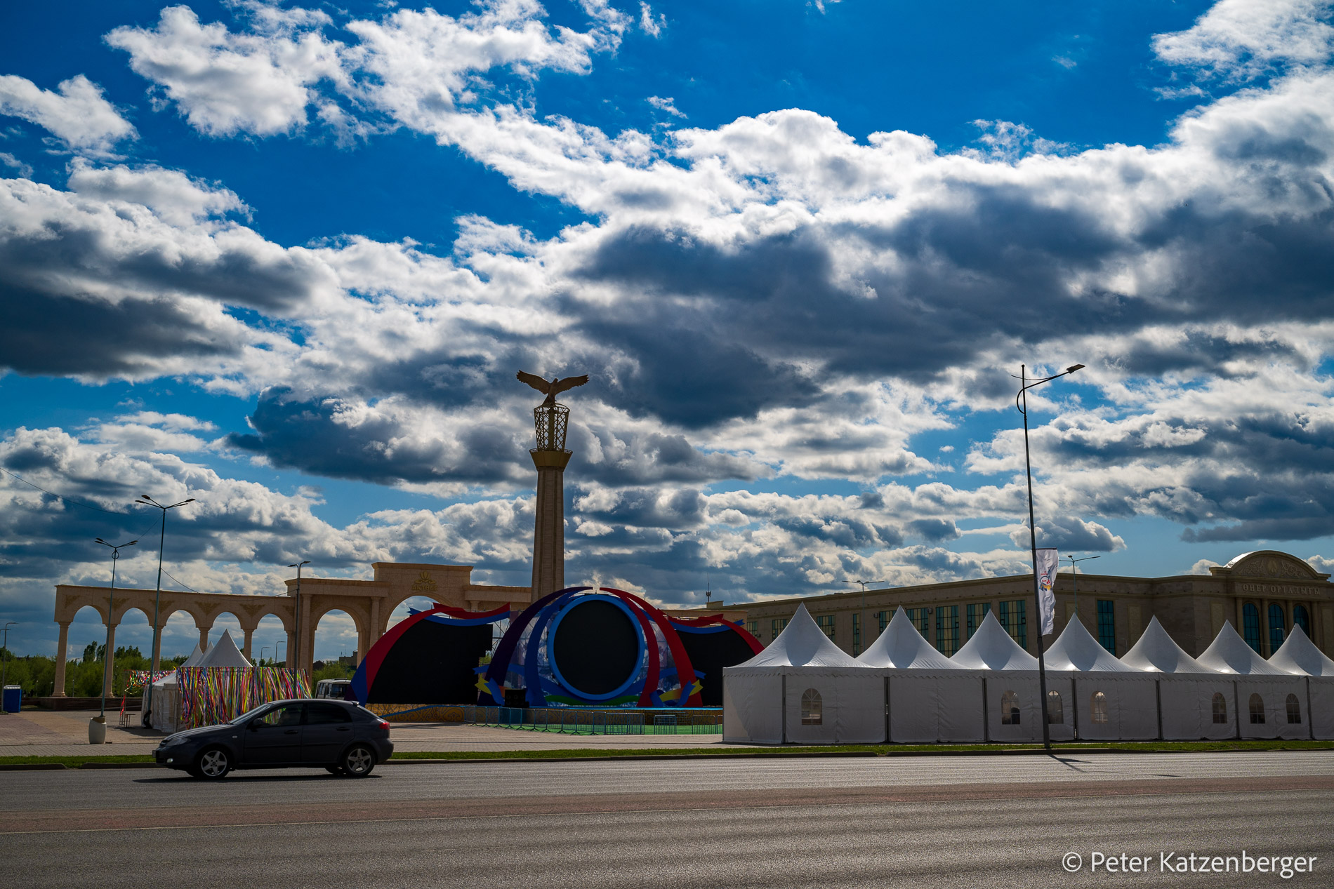 Der Weg zu den bekanntesten Bauwerken der Stadt, der Nurgasyr-Moschee und der russisch-orthodoxe Nikolaus-Kathedrale führte an der Konzerthalle vorbei.