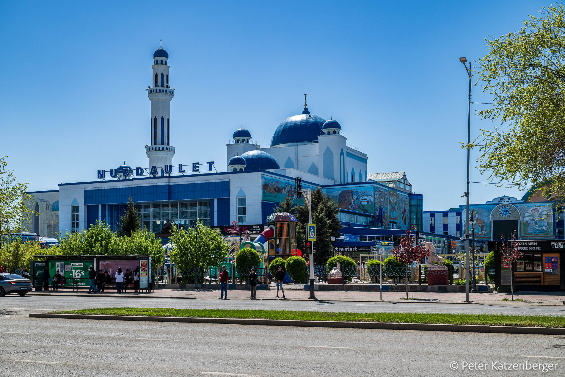 Eine weitere große Moschee ist die sogenannte „Blaue Moschee“, die Nurdaulet-Moschee. Hier wurde in derselben Farbgebung ein Einkaufszentrum angegliedert. Das fanden wir lustig.