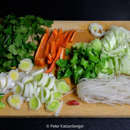 Für die Suppe benötigt ihr eine Gemüsebrühe, asiatisch gewürzt. Ich mache diese immer im Vorrat, wenn ich besonders viele Gemüsereste habe (Schälreste von Karotten, harte Enden vom Lauch, Tomatenreste, Zwiebeln, Sellerie etc.). Man kann jedoch gut 2 Bund Suppengemüse dazu verwenden. Man schneidet dann diese in grobe Stücke und kocht sie in 2,5 Liter Wasser mit 1 EL Salz, 4 Sternanis, 1 Zimtstange, 2 Chilis (jeweils halbiert), 2 Knoblauchzehen ca. 1 Stunde auf. Natürlich kann man die Brühe mit Reste von Rindfleisch oder Hühnerfleisch vervollständigen. Ich selbst mag die vegetarische Variante gerne.