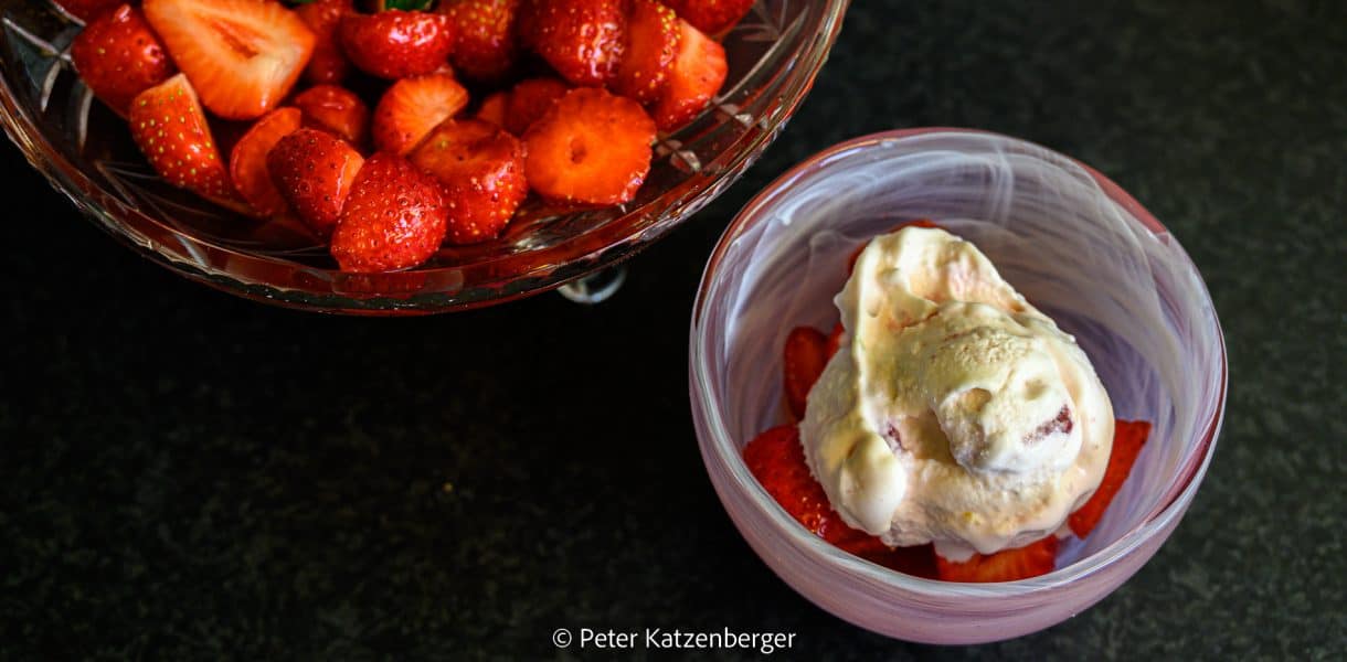 Rezepte mit Schwips – Erdbeeren in Erdbeerlikör mit einer Kugel Yoghurteis mit Erdbeerstückchen