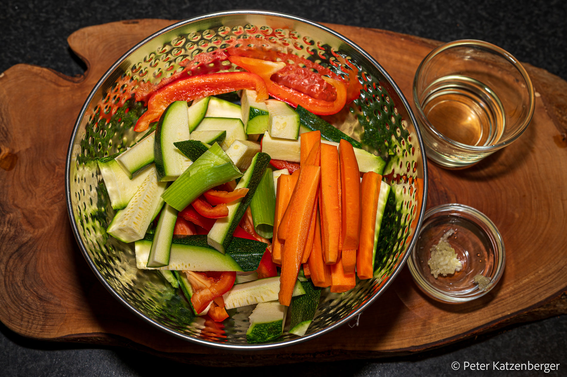 - 400 g gemischtes Gemüse (Karotte, Zucchini, Frühlingszwiebeln) in Streifen geschnitten