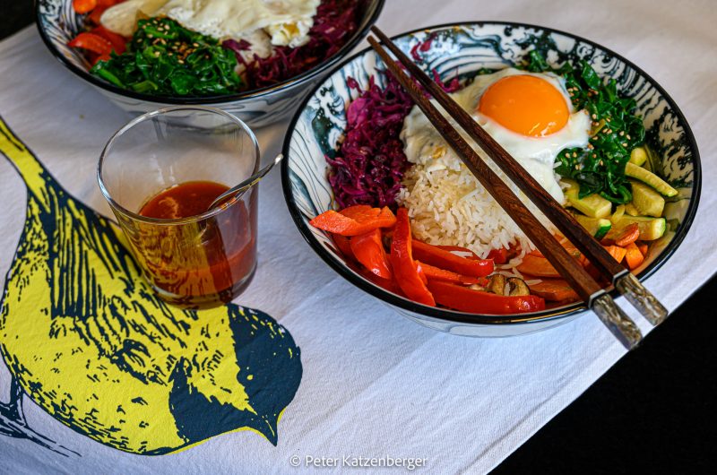 Verschieden Gemüsesorten, das Ei und die würzige Bibimbap-Sauce harmonieren super. Die Sauce passt sicher gut zu weiteren Bowl-Varianten.