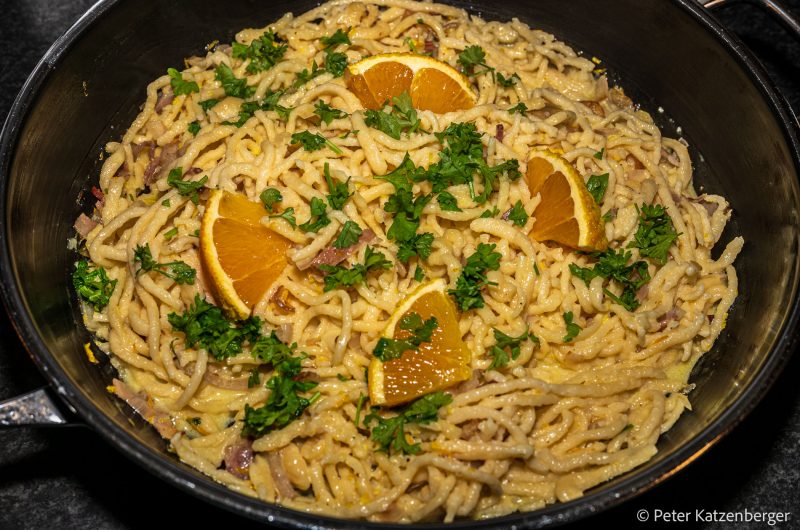Jetzt ist Orangenzeit und die Orangen-Speck-Rahmsauce schmeckt sensationell zu den Spätzle. Ein Leben ohne Spätzle ist möglich, aber sinnlos, wie die Schwäbin sagt.