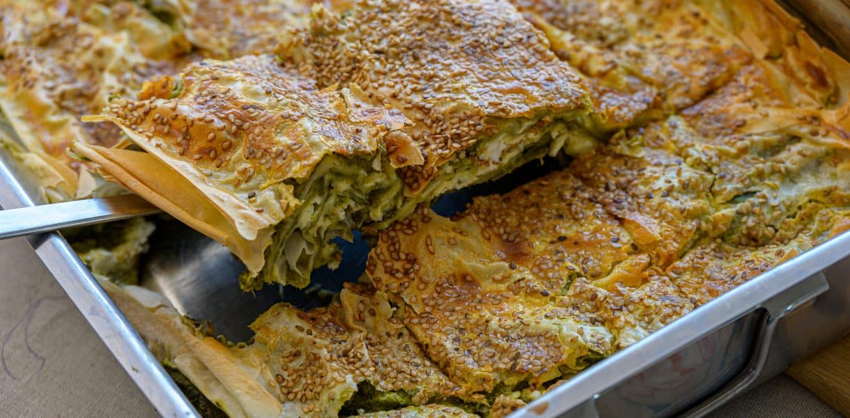 Die griechische Spinatpastete passt prima zu einem Picknick, da sich die Gebäckstücke aus der Hand essen lassen.