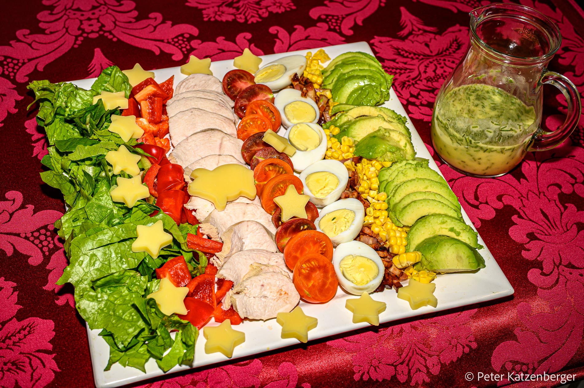 In diesem Jahr freue ich mich sehr, wieder beim kulinarischen Adventskalender von Zorra von kochtopf.me dabei sein zu dürfen! Hinter Türchen Nummer 20 versteckt sich ein "Cobb-Salad" Rezept. Das erste Gewinnspiel beim kulinarischen Adventskalender ist schon vorbei, ein weiteres Gewinnspiel, mit vielen tollen Gewinnen, findet vom 24. Dezember 2025 – 2. Januar 2026 statt. Es lohnt sich, täglich bei den Türchen vorbeizuschauen, um später alle Gewinnspielfragen beantworten zu können.Nun zu meinem Rezept. Als Picky Eater werden im Englischen Menschen bezeichnet, die beim Essen wählerisch sind. Ich stelle mir dabei einen Vogel vor, der vor einer Schale mit Körnern sitzt und ganz genau hinschaut, welche ihm schmecken könnten. Als Kind hätte man mich als „Picky Eater” bezeichnen können. Es war nicht so, dass ich eine begrenzte Liste an Lebensmitteln hatte, die mir schmeckten. Es gibt ja Kinder, die nur Nudeln essen und sogar die Soße dazu verschmähen. Das war bei mir nicht so. Eher hatte ich einfach nicht immer Hunger. Ausprobiert habe ich schon immer gerne. Entdeckergeist und kulinarische Neugier waren schon immer vorhanden. Die vielen süßen Plätzchen, die um Weihnachten herum in großer Fülle auf den Tisch kamen, waren einfach zu viel für mich. Da freute ich mich immer auf eine herzhafte Mahlzeit. Beglückt war ich, wenn ich aus einer Fülle kleiner Köstlichkeiten wählen durfte. Auch mein Auge wollte mitessen. Ich mochte es bunt. Weihnachtszeit ist Familienzeit. Es ist gar nicht so einfach, etwas zu kochen, das allen schmeckt. Es gibt Vorlieben, Abneigungen, Unverträglichkeiten sowie Fleisch- und Gemüseliebhaber. Ich rätsele seit Monaten darüber, was ich kochen könnte. Die Festmenüs stehen, aber es fehlt noch eine einfachere Hauptspeise. Diese sollte allen schmecken. Alle freuen sich, wenn sie merken, dass an sie mitgedacht wurde. Für mich ist der "Cobb-Salad" die Lösung. Was ist das? Ein "Cobb-Salad" ist ein amerikanisches Gericht aus Salat, Speck, Hühnchen, Käse, Tomaten und weiteren Zutaten. Alles wird in ordentlichen Reihen angeordnet. Es ist ein Hauptgericht. Er wurde angeblich im Restaurant „Brown Derby“ in Hollywood kreiert.Der Vorteil bei diesem Gericht ist, dass auch ein "Picky Eater" beigeistert zulangt. Er kann wählen, was sie/er mag. Und immer sieht es auf dem Teller bunt aus.Man kann den Salat übrigens prima vorbereiten und dann erst bei Bedarf auf der Platte anrichten. Man muss also nicht erst kurz vor dem Servieren das Hühnchen pochieren und den Speck knusprig anbrutzeln – das geht schon einige Zeit vorab.Dazu gibt es Brötchen oder Baguette. Probiert es aus. Auch wählerische Gäste werden sich super gesehen fühlen und kräftig zulangen. Die Salatsoße träufelt jede/jeder selbst darüber.