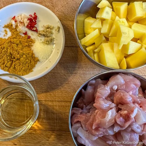 - Die Hähnchenwürfel darin etwas anbraten, die Kartoffelwürfel zufügen.
