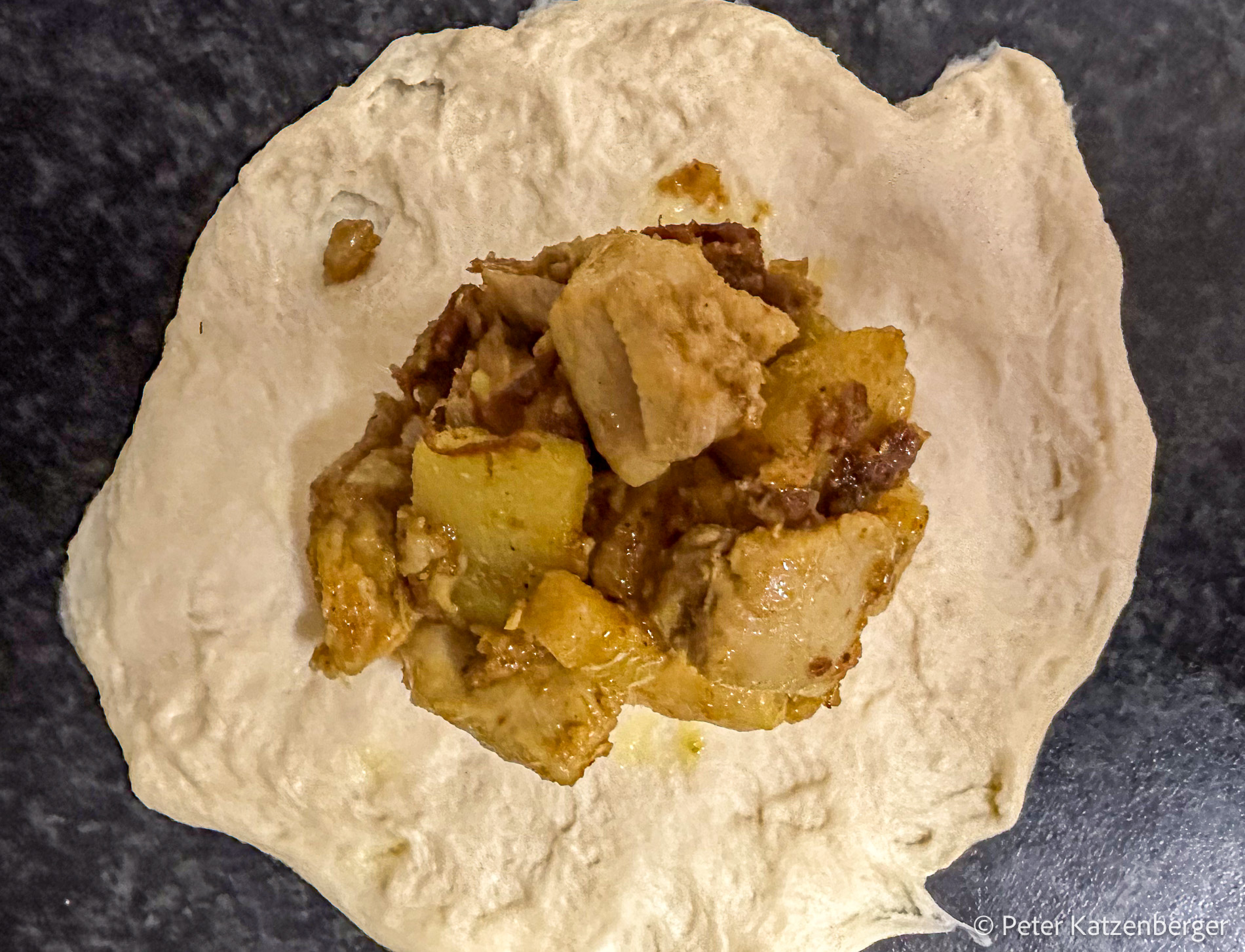 - 2 EL abgekühltes Curry daraufgeben und die Enden des Teigkreises in der Mitte zusammenführen.