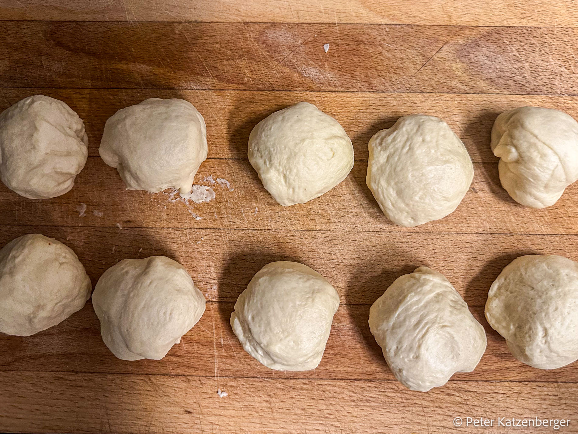 - Den Hefeteig in 10 Teile à ca. 65 g aufteilen und zu Kugeln formen.