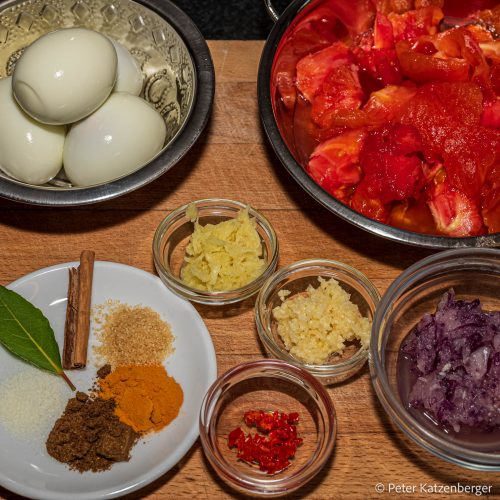 Für das Blog-Event CCXVIII zum Thema Currys der Welt, eine kulinarische Reise voller Aromen, organisiert von Zorras Kochtopf.me und der Gastgeberin Cornelia von Silvertravellers koche ich ein einfaches indisches Currygericht. Eiercurry enthält, wie der Name schon sagt, hartgekochte Eiern. Dieses Curry ist sehr schnell zubereitet. Die Zutaten dafür habe ich meistens zu Hause. Ich liebe die scharfe, würzige Küche Süd- und Südostasiens, die ich auf Reisen nach Indien, Vietnam, Kambodscha und Laos vor Ort kennengelernt habe.Was braucht man dafür? Ein Eiercurry wird mit hartgekochten Eiern, Zwiebeln und geschälten und entkernten Tomaten zubereitet. Damit es authentisch schmeckt, braucht man auf jeden Fall eine Ingwer-Knoblauchpaste und natürlich Gewürze. Apropos Ingwer-Knoblauch-Paste: Dieses Duo ist aus der indischen Küche nicht wegzudenken – eine echte Geheimwaffe, um Currys eine kräftige, würzige Basis zu geben. Auch die Kombination aus scharfem Ingwer und würzigem Knoblauch ist schnell gemacht. Dazu braucht man eine feine Reibe aus Edelstahl. Damit lässt sich der frische Ingwer gut reiben. Den Knoblauch presst ihr durch die Knoblauchpresse. Die Wunderpaste unterstützt eure Gesundheit. Ingwer ist für seine verdauungsfördernden Eigenschaften bekannt, Knoblauch für seine antibakterielle Wirkung. Zusammen sind sie nicht nur ein kulinarisches, sondern auch ein gesundheitliches Dreamteam.Zu den Gewürzen. Zu einem Curry gehört meiner Meinung nach immer eine scharfe Chilischote. Sie wird fein gehackt oder falls ihr es nicht so scharf mögt, halbiert, entkernt und nur mitgekocht. Mein Eiercurry wird zusätzlich mit Kurkuma, Garam Masala, einem Lorbeerblatt, Salz und Zucker und einem Stück Zimt gewürzt.