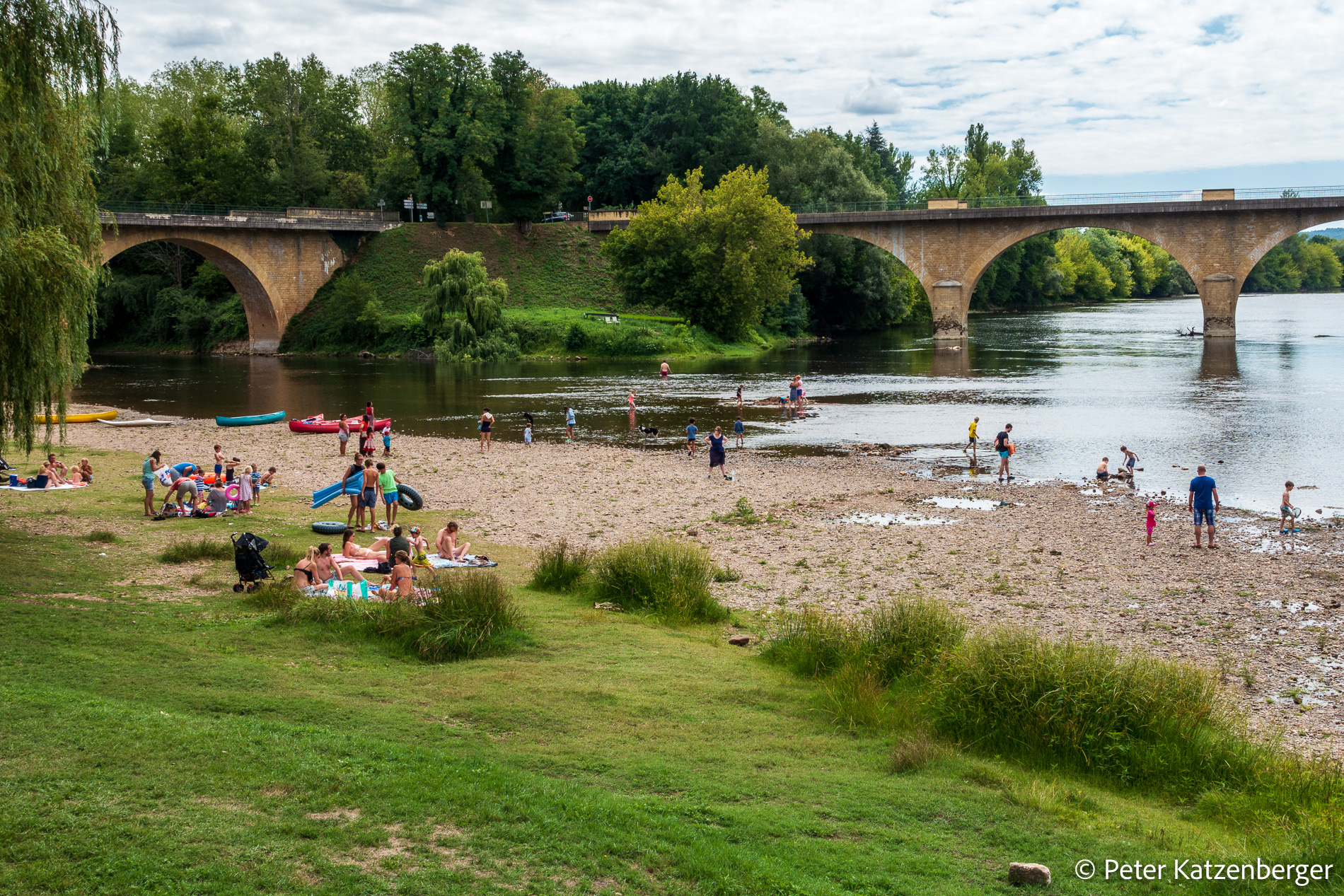Heute planen wir einen Ausruhtag. Das bedeutet, sich mit Sonnencreme einschmieren, Sonnenhut aufsetzen, ein Liegetuch schnappen und auf an die Dordogne. Wir suchen uns ein Plätzchen am Ufer, um dem heiteren Treiben zuzuschauen. Kinder und Erwachsene kühlen sich im Nass, bauen Staudämme, bespritzen sich oder lassen sich einfach nur treiben. Ich kann stundenlang dem heiteren Treiben zuschauen. Ab und zu geht es zu einem Kaffeepäuschen oder zu einem Snack zum Bistro direkt am Fluss (L’ancre du salut). Was für eine Idylle pur.
