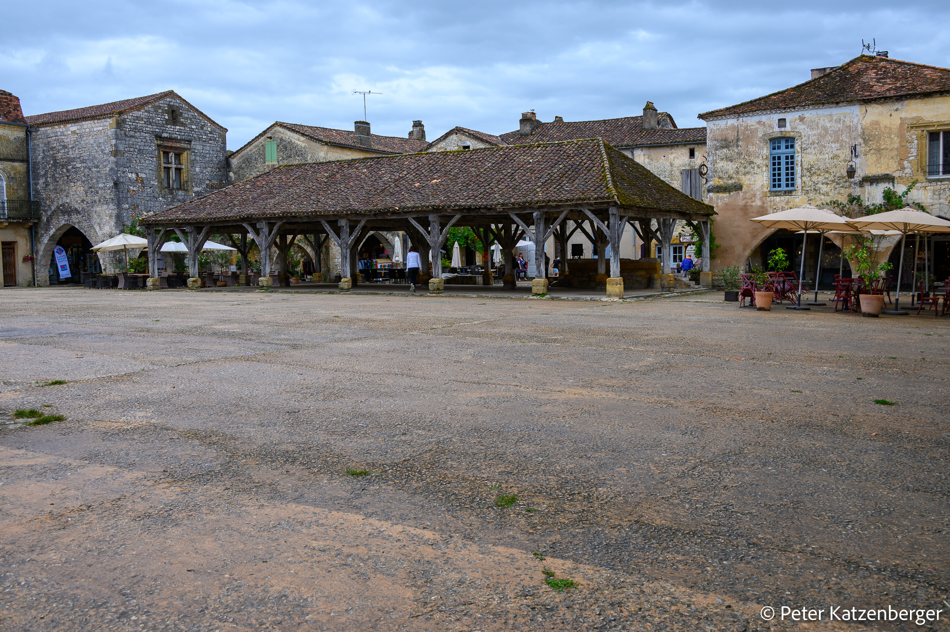 Dann erwartet uns eine der schönsten Bastiden, Monpazier. Monpazier ist über einem Rechteck mit streng rechtwinklig verlaufenen Straßenzügen um einen zentralen Platz angelegt. Besonders schön sind die Arkaden, die sich zum Platz hin öffnen.