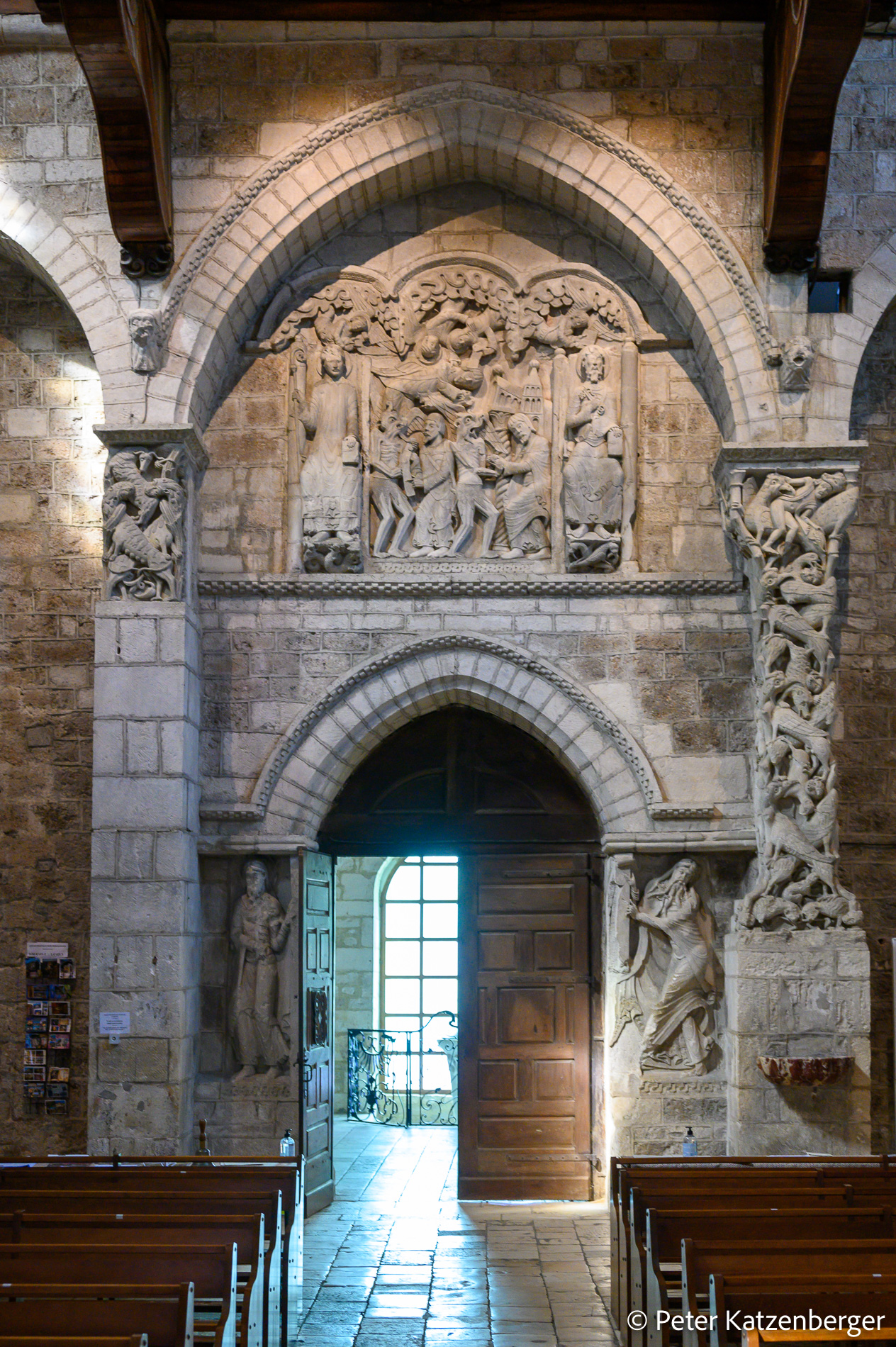 Schon das große Relief über der Tür, zeigt unter den dreilagigen Wellenbändern (Wolken des Himmels) die Legende von Theophilus, der mit dem Teufel einen Pakt schloss. Theophil bereut und büßt, mit Erfolg. Die Unterschrift von ihm wird gelöscht, die heilige Jungfrau und der Erzengel Michael erscheinen ihm. Begleitet wird die Szene von Petrus und Benedikt und Teufeln in mehreren Varianten.