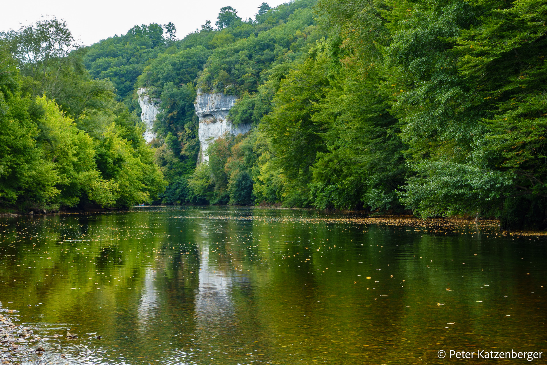 Die Vézère wird gesäumt von Bäumen, an den Felsabhängen blitzen die Kalkfelsen hervor, die Flussschleifen sind mal seichter, mal ist es wieder wie ein See. Ab und zu müssen wir aussteigen und das Boot vorsichtig über die Kiesel schieben. Nach 10 km sind wir in der kleinen Stadt Le Bugue.