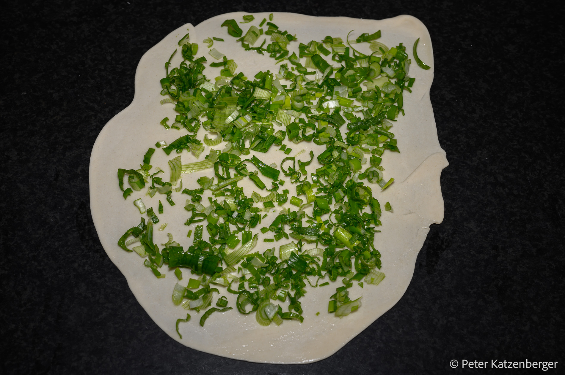 - Die Oberseite mit Öl bestreichen (ca. 1 EL) und mit einer Frühlingszwiebelnprotion bestreuen und mit etwas Salz und Pfeffer bestreuen.