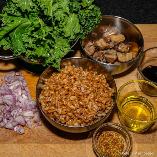 - 120 g Dinkelkerne in einem Töpfchen ca. 30 Minuten weich kochen (oder etwas schneller im Dampfkochtopf)