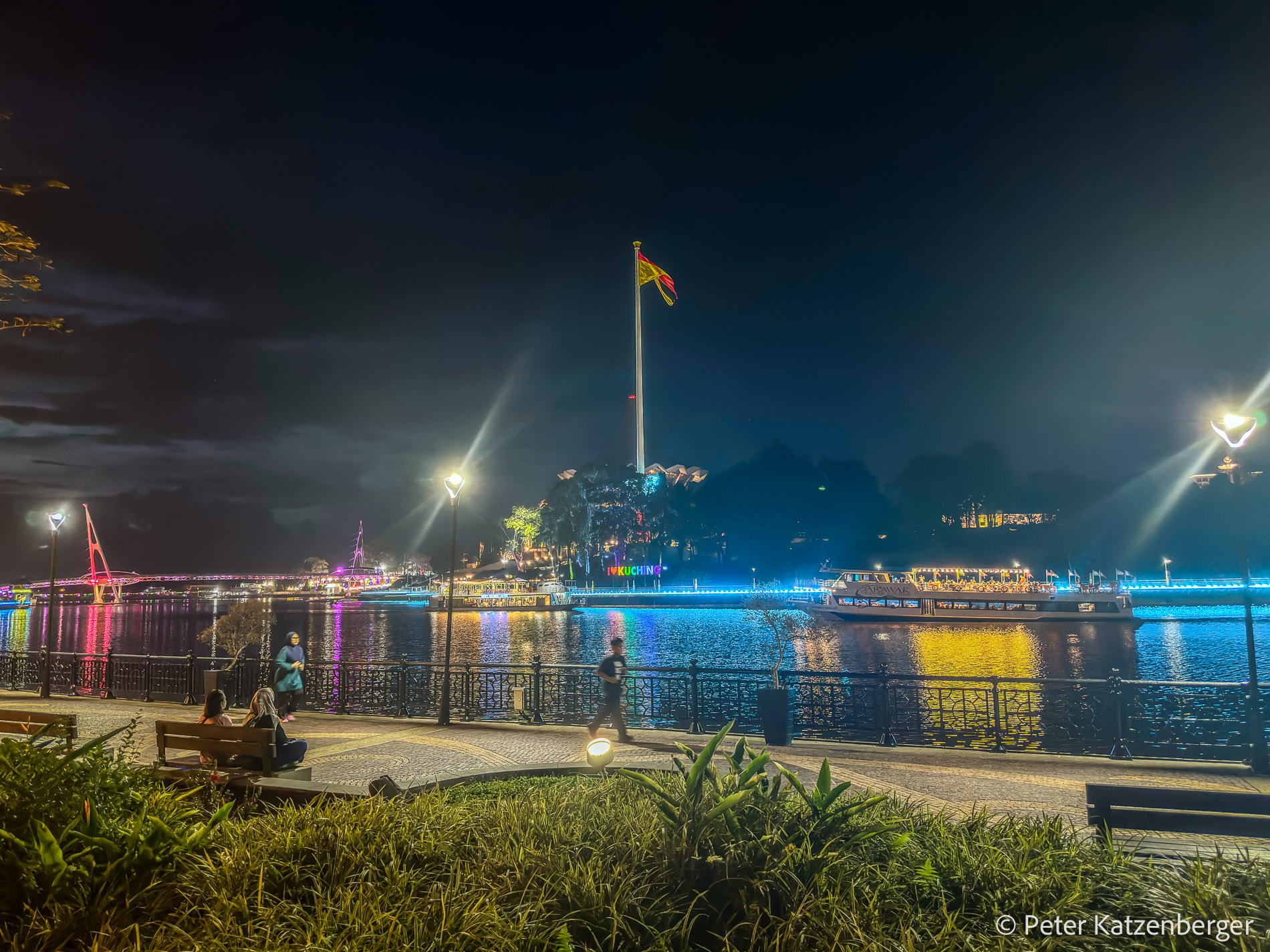 Nach dem Essen spazieren wir entspannt am Fluss entlang. Wir sehen den 99 Meter hohen Fahnenmast und das Parlamentsgebäude.