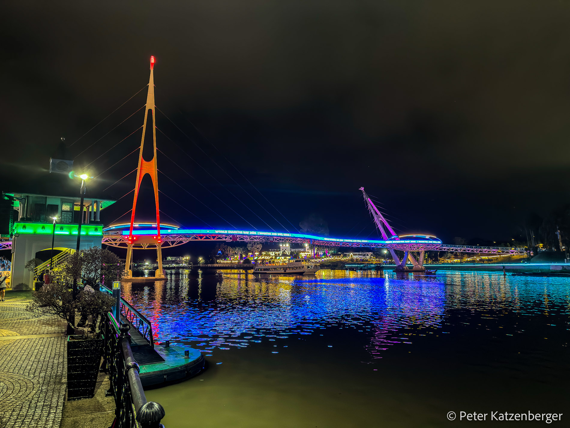 Am Square Tower, dem ehemaligen Gefängnis vorbei überqueren wir den Fluss über die geschwungene Darul Hana Brücke.