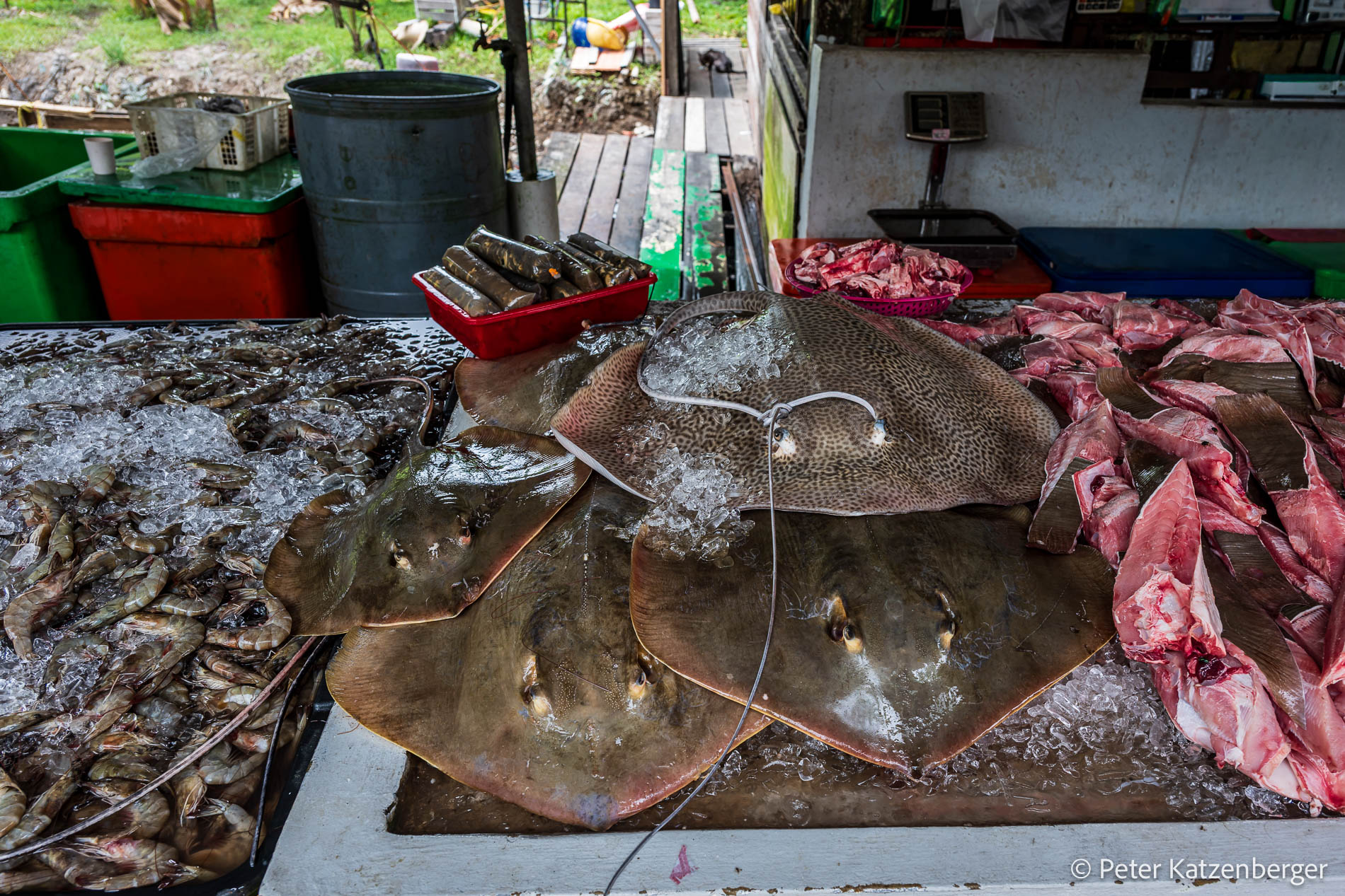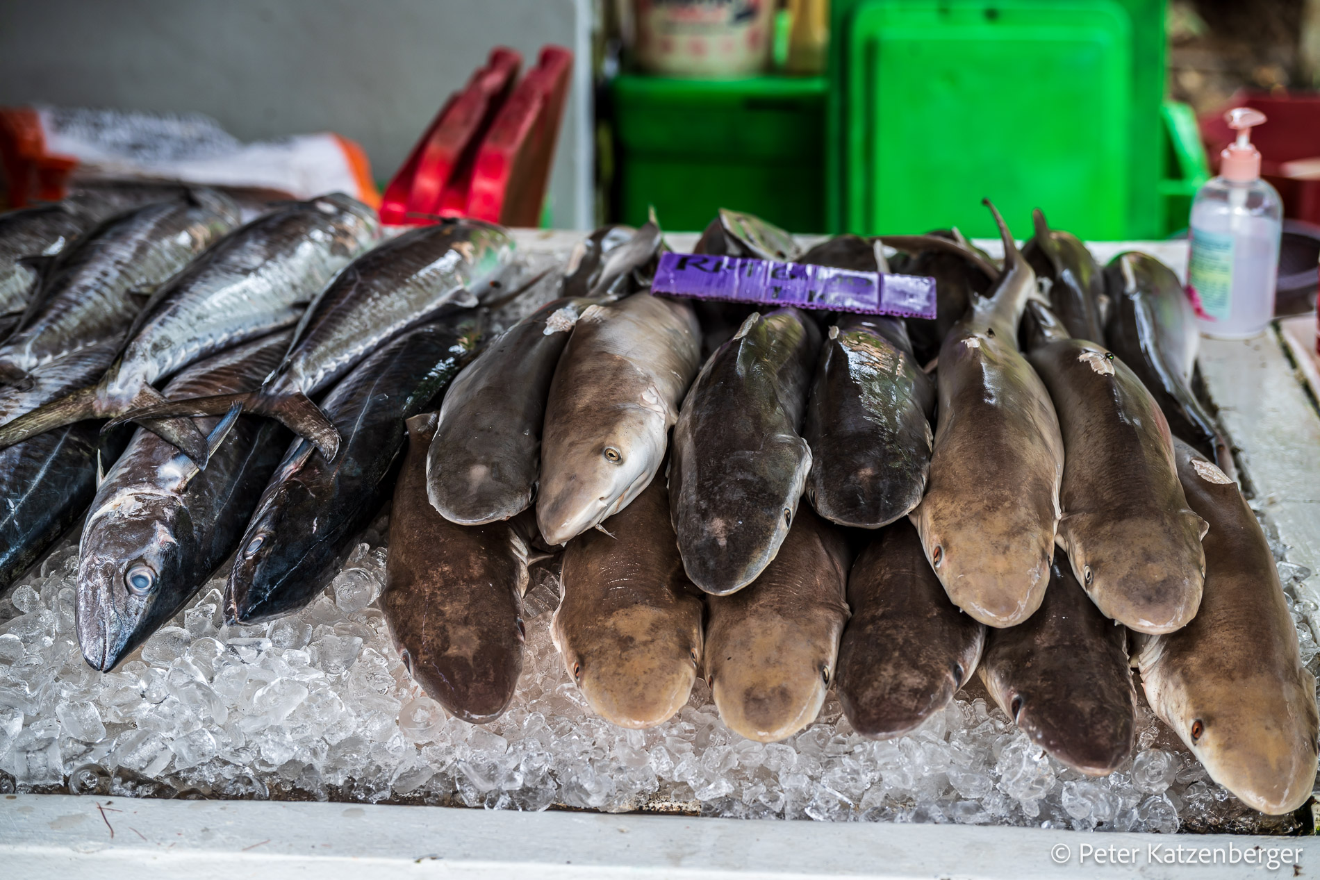 Wieder am Ausgangspunkt angelangt, spazieren wir an Fischständen vorbei mit einer riesigen Auswahl an frischen exotischen Fischen zu einem Fischrestaurant. Wir essen gemeinsam zu Mittag. Leider wird kein Fisch serviert.“