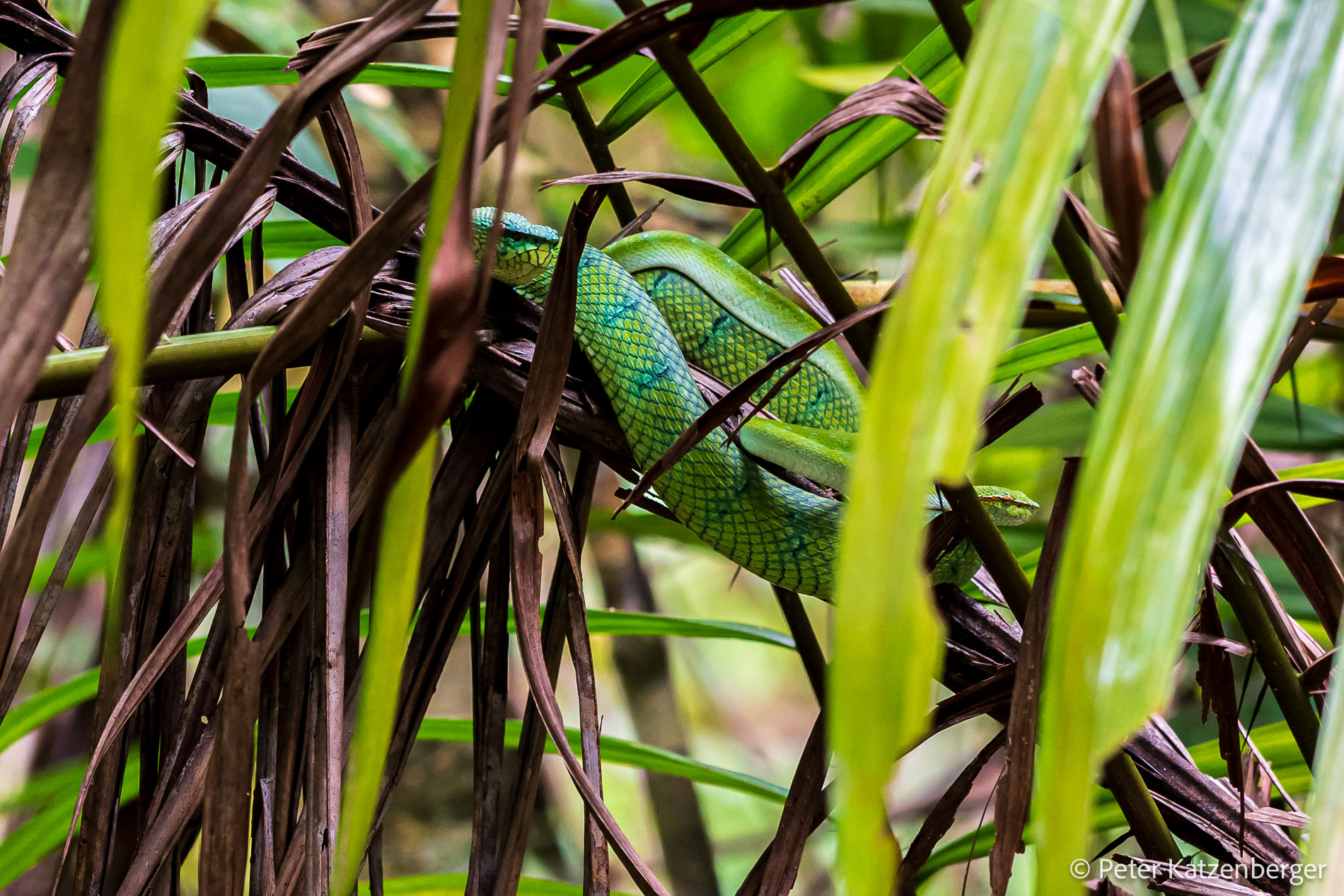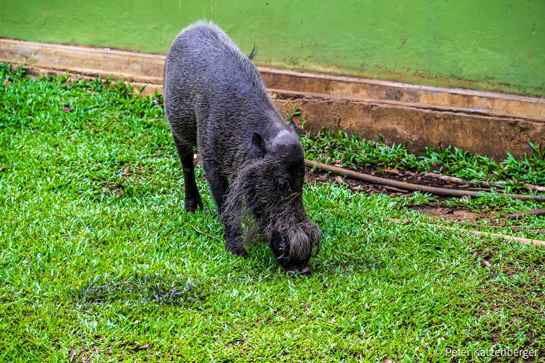 Eigentlich sollten hier Langnasenaffen zu sehen sein, aber die haben sich in eine andere Ecke des Parks verzogen. Dafür sehen wir zwei äußerst giftige Schlangen, die jedoch mit sich selbst beschäftigt sind sowie ein geflügeltes Säugetier, eine überdimensionale Fledermaus, die reglos an einer Palme hängt und später ein Wildschwein.
