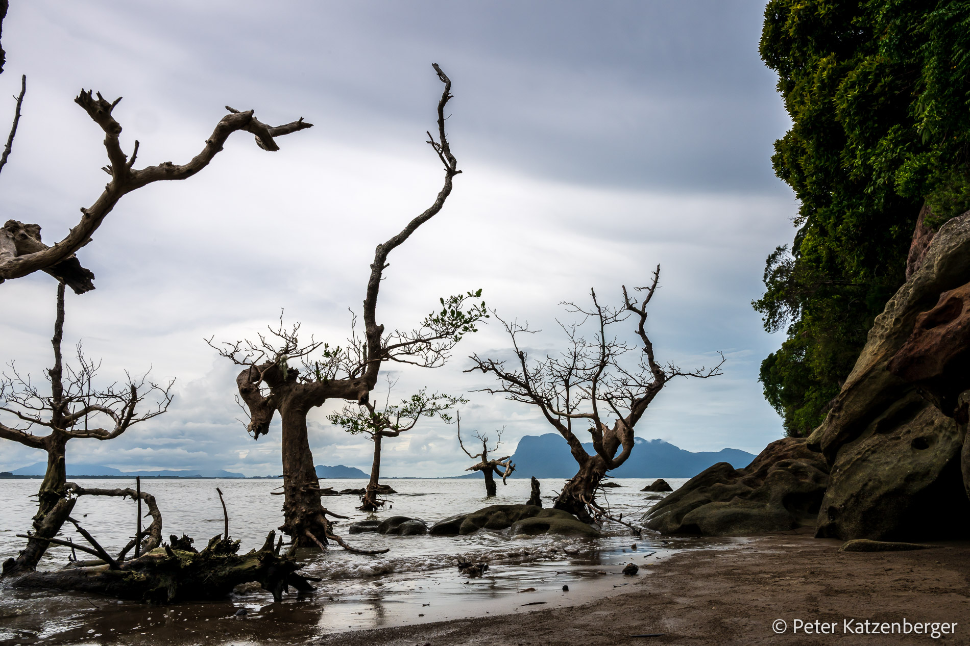 Eine kleine Wanderung über Wurzeln und Felsen führt uns zu einem anderen Strand mit Mangroven.