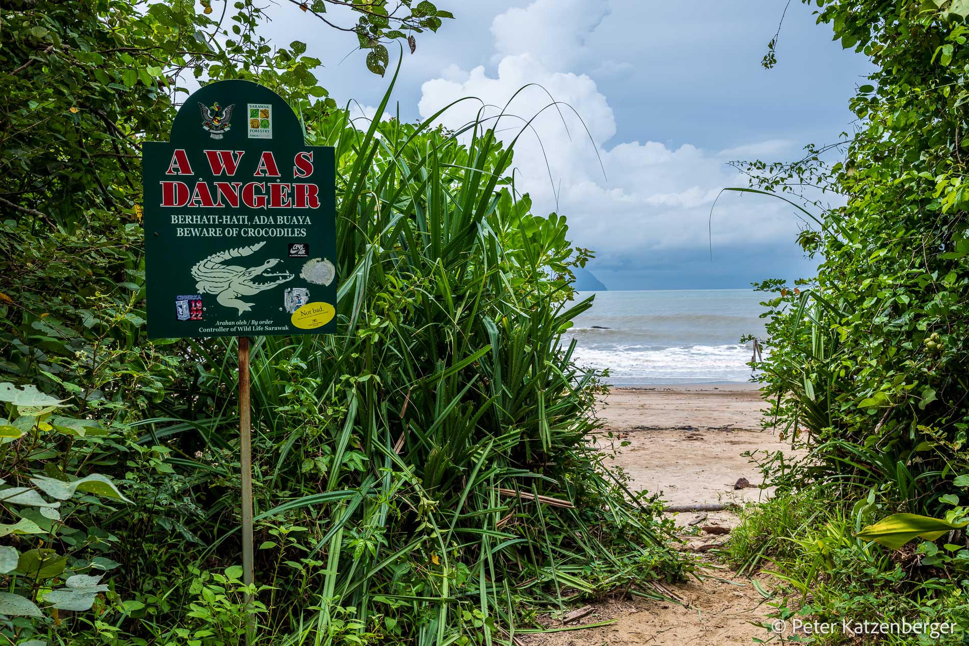 Da gerade Ebbe ist, fahren die Boote an einen kleinen Sandstrand und wir waten die letzten Meter an Land. Überall hängen Schilder, die vor Salzwasserkrokodilen warnen – aber hier haben sie offensichtlich keinen Appetit auf leckere Touristen.