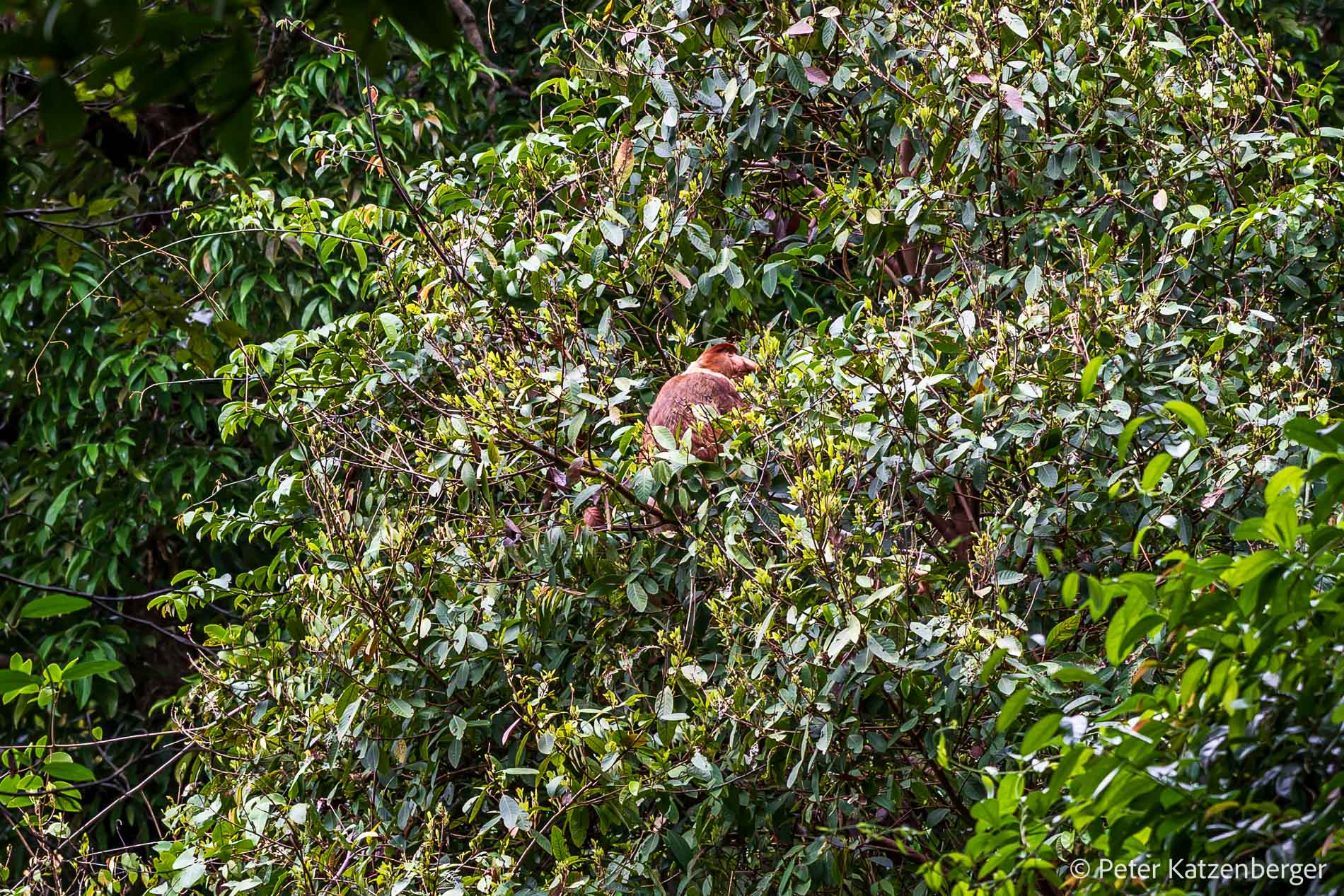 Und tatsächlich springt auch ein Langnasenaffe durch die Äste und futtert Blätter!