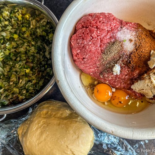 - In einer großen Schüssel das Hackfleisch, die Eier, die Zwiebel-Petersilie-Lauchmasse, die Gewürze, das halbe Brötchen gut vermischen.