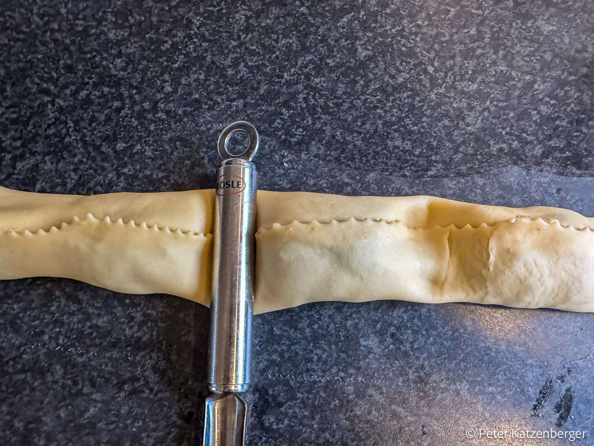 - Zwischen den Segmenten den Teig eindrücken und mit einem Teigrädchen durchschneiden.