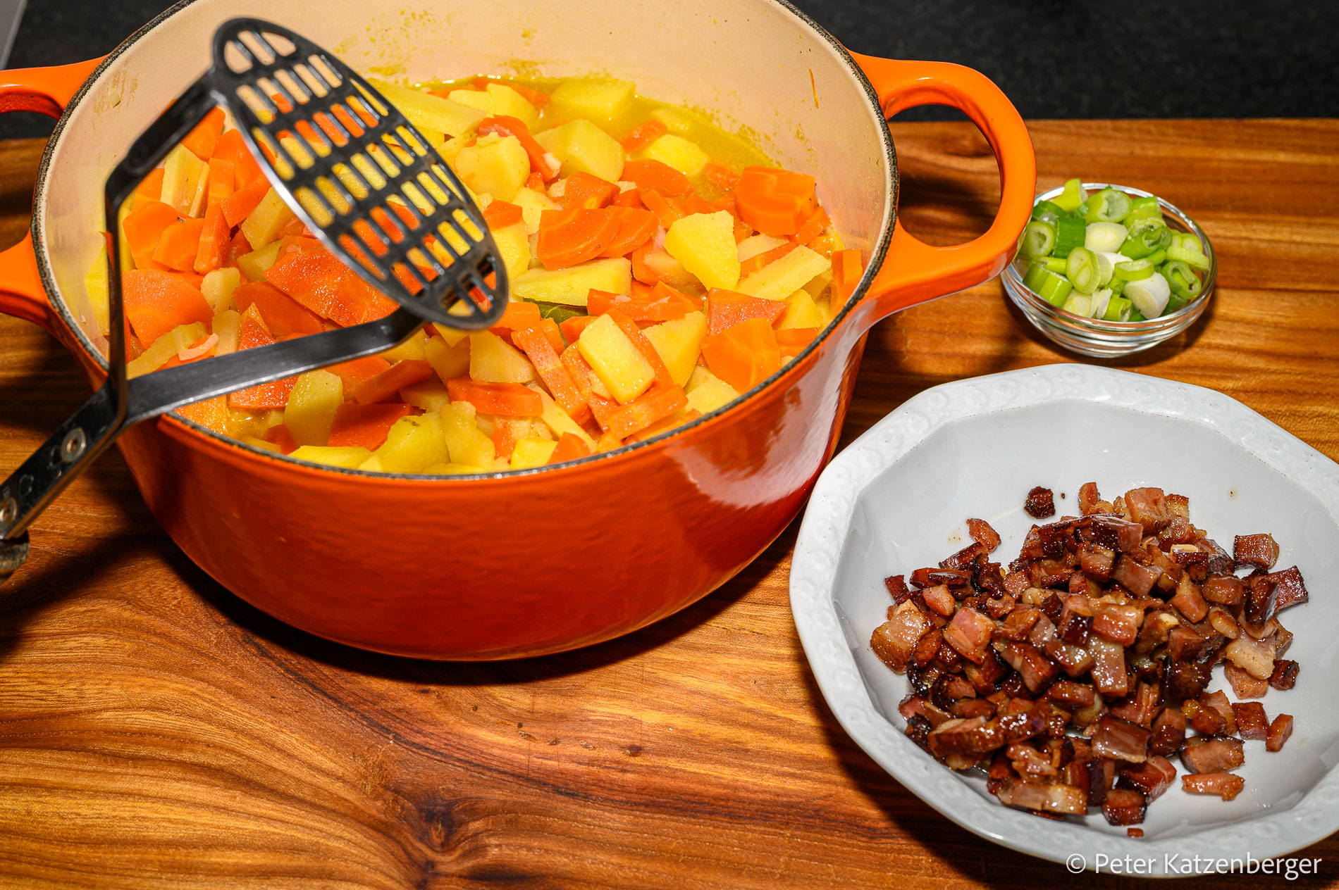 - Zum Schluss das Ganze mit einem Kartoffelstampfer etwas einstampfen. Die Karotten und Kartoffelstückchen sollten jedoch sichtbar bleiben. Eventuell mit Pfeffer und Salz nachwürzen.
