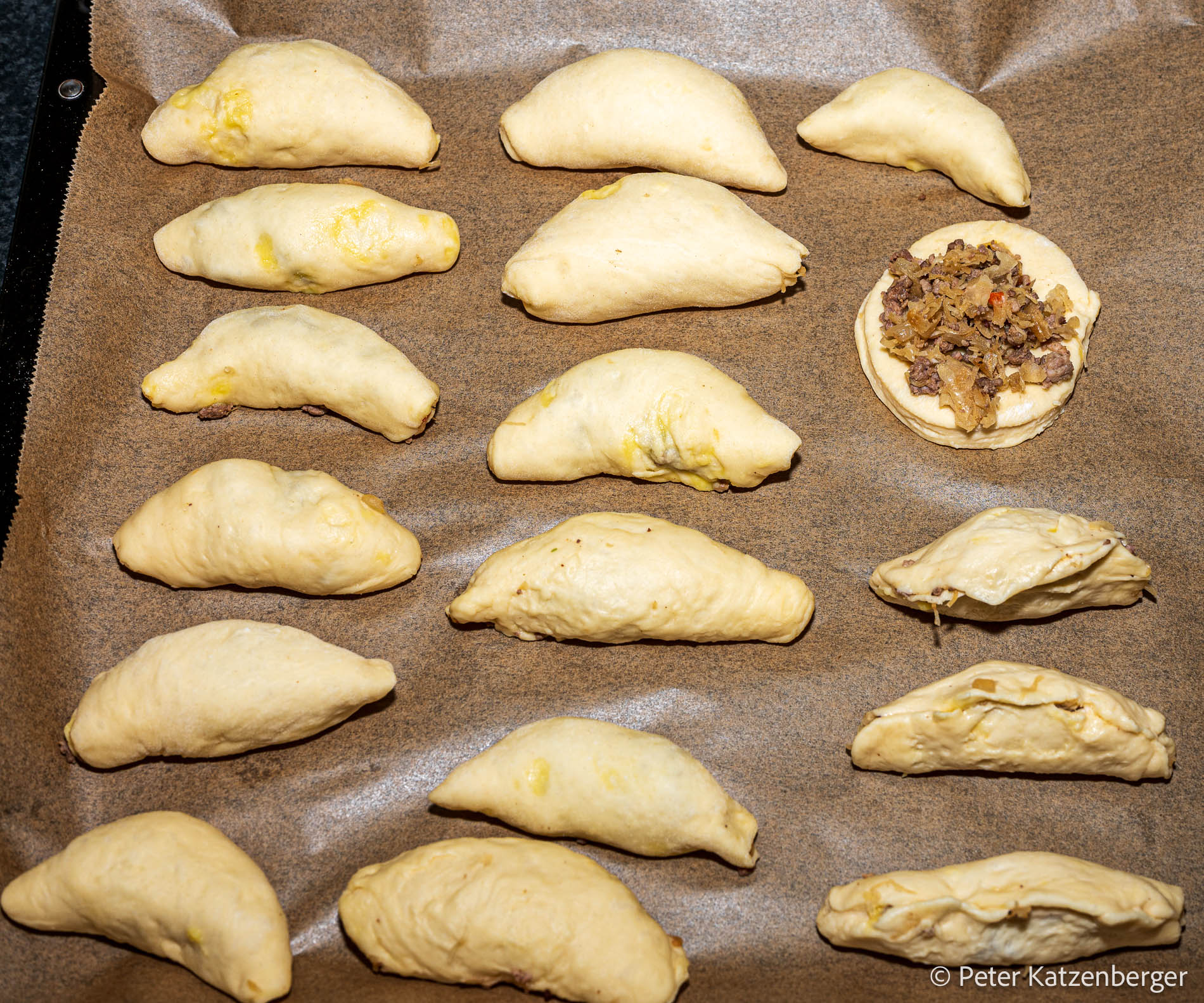 Mit der kulinarischen Weltreise und unserem Reiseleiter Volker von volkermampft.de reisen wir im Januar nach Estland.Aus dem Kochbuch "Vilnius" entnahm ich Rezeptvorschläge aus Litauen. Jetzt geht es also zum Nachbarstaat Estland. Mich beschäftigt die Frage, ob es ein estnisches Nationalgericht gibt. Hier recherchierte ich. Auch das Team der Lebensmittelakademie, das estnischen Rezepte in einem Kochbuch im Leopold Stocker Verlag (2019) zusammengefasst hat, hat darauf keine Antwort. Aber Rezepte gibt im Kochbuch, das schlicht "Estnische Küche" heißt, viele. Leider entdecke ich keines, das ich nachkochen möchte.Natürlich ist es eine Herausforderung ein Nationalgericht zu haben, wenn man abwechselnd von Dänen, Schweden, Deutschen und Russen besetzt wurde. Die nationale Identität muss sich dann erst entwickeln. Man sagt, dass die estnische Küche im Winter deftig ist. Es gibt Sauerkraut, Linsensuppe und die Suppe Seljanka, die estnische Variante der russischen Soljanka.  Andres Simonson, ein Amerikaner der ersten Generation mit estnischen Wurzeln, bricht im Blog „estonianworld.com“ eine Lanze für Pirukad (Plural Pirukad, Singular Pirukas), deren Zubereitung er von seiner Großmutter gelernt hat.Als Liebhaberin der Bistro-Küche mag ich Teigtaschen in allen Variationen. Andres Simonson erzählt, dass Pirukad meist in der Familie zubereitet werden. Also werde ich mich an die Herstellung von Pirukad wagen. Dafür braucht es eine Fleischfüllung. Ich entscheide mich für Fleisch, Zwiebeln und Sauerkraut, das passt jetzt im Winter. Friederike hat die Pirukad auch gebacken. Das spricht für diese. Sie schmecken einfach sensationell.