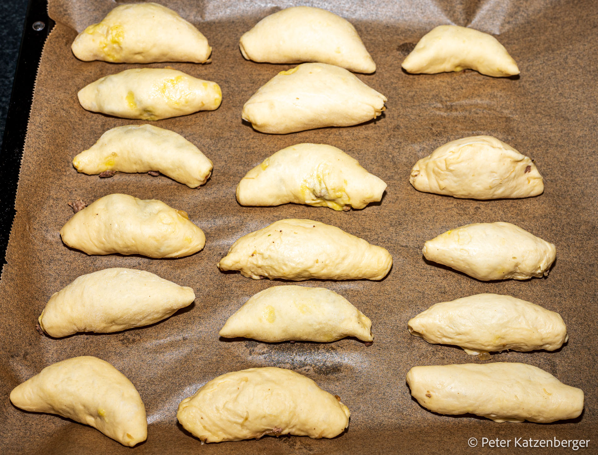 - Den Backofen auf 180 ° Ober-Unterhitze vorheizen und die Teigtaschen ca. 25 Minuten goldgelb ausbacken.