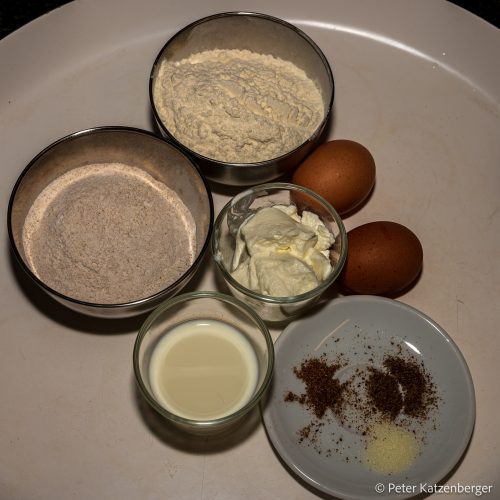 - Das Mehl, das Buchweizenmehl, die Eier, den Quark, die Milch, den Pfeffer, die Muskatnuss, das Salz mit dem Handrührer verrühren.