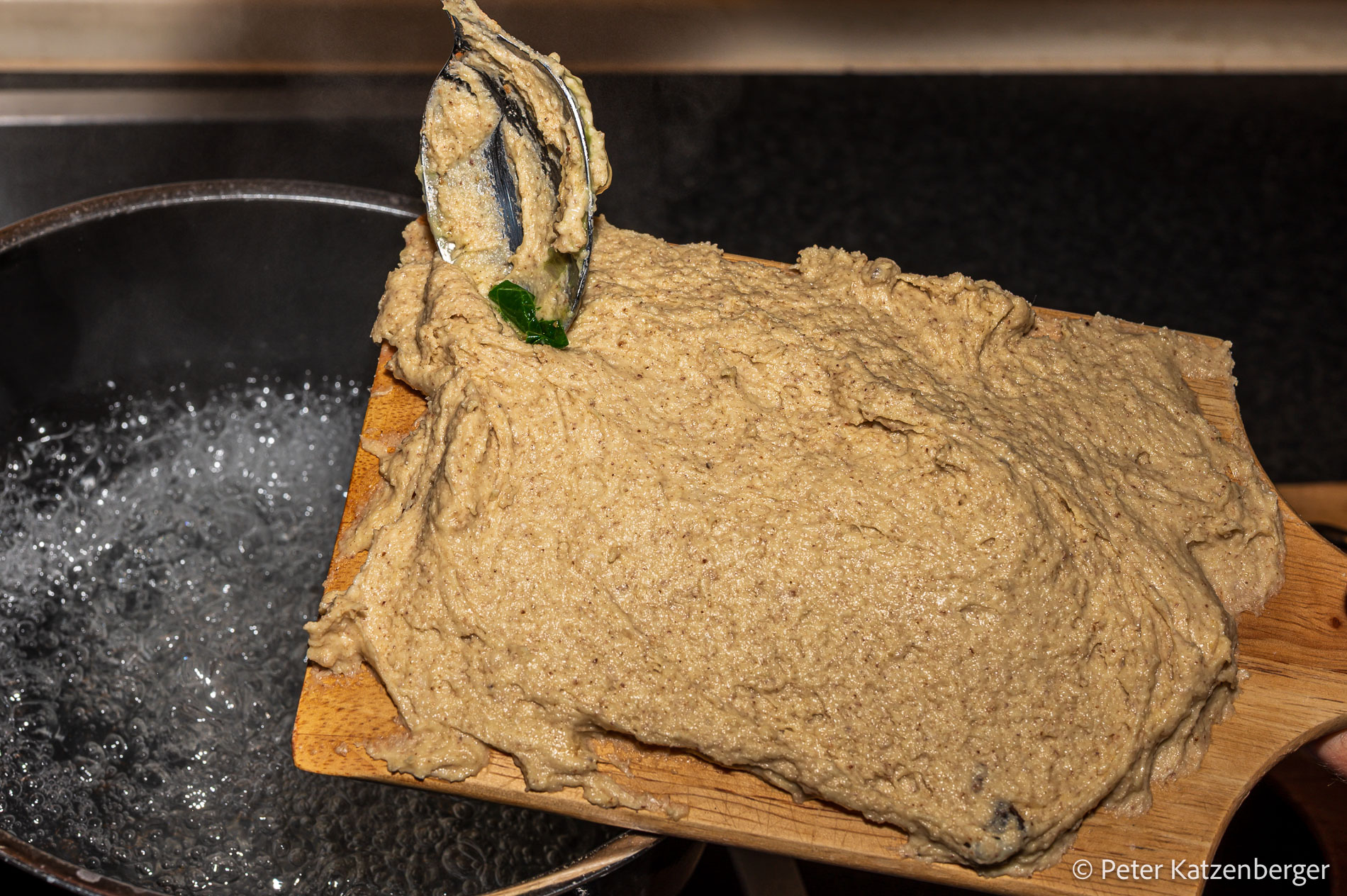 - Nun werden mit einem Esslöffel Pizokel abgestochen. Sobald diese oben schwimmen, kann man diese mit einem Schaumlöffel aus dem Wasser holen.