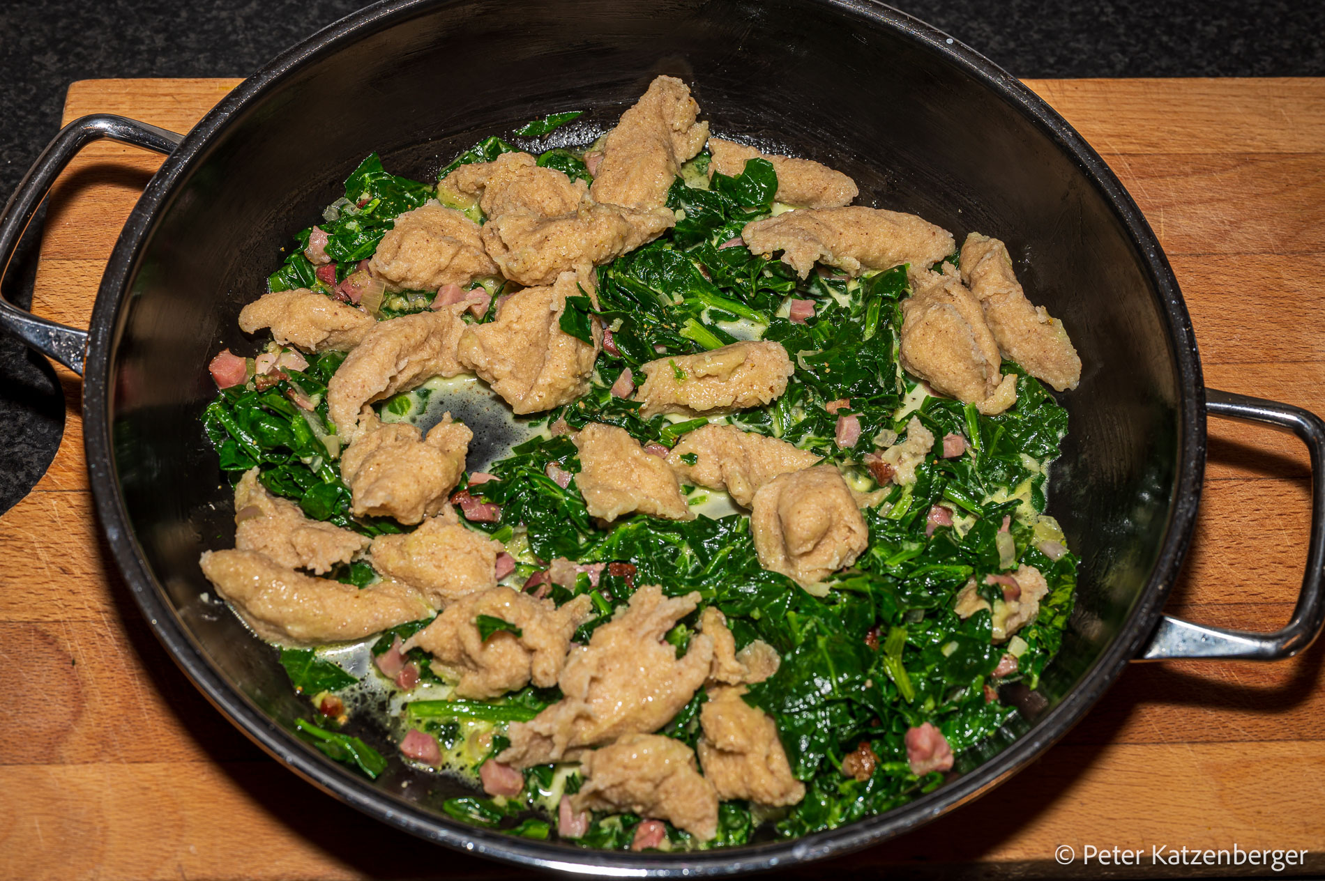 - Sobald die Speckwürfel etwas Farbe annehmen, wird der Spinat darüber gegeben.