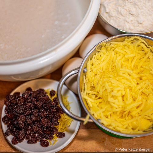 - 300 g festkochende Kartoffeln geschält, gerieben (mittelfein) und in einem kleinen Sieb das Stärkewasser ausdrücken