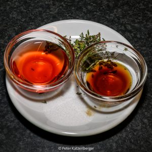 - Sobald der Puls schön angedickt ist, kommen die Gewürze hinzu (Thymian-Blättchen, Rotweinessig, Thymian, Fischsoße und Petersilie).