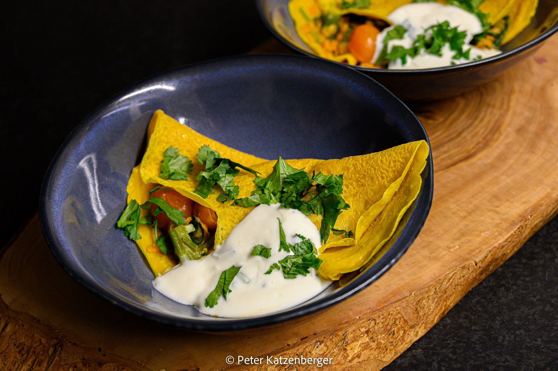 - Jeweils in ein Roti das Linsen-Dal geben, das Roti zur Hälfte zusammenklappen, mit etwas Yoghurtsoße beträufeln und mit frischem Koriander bestreuen.