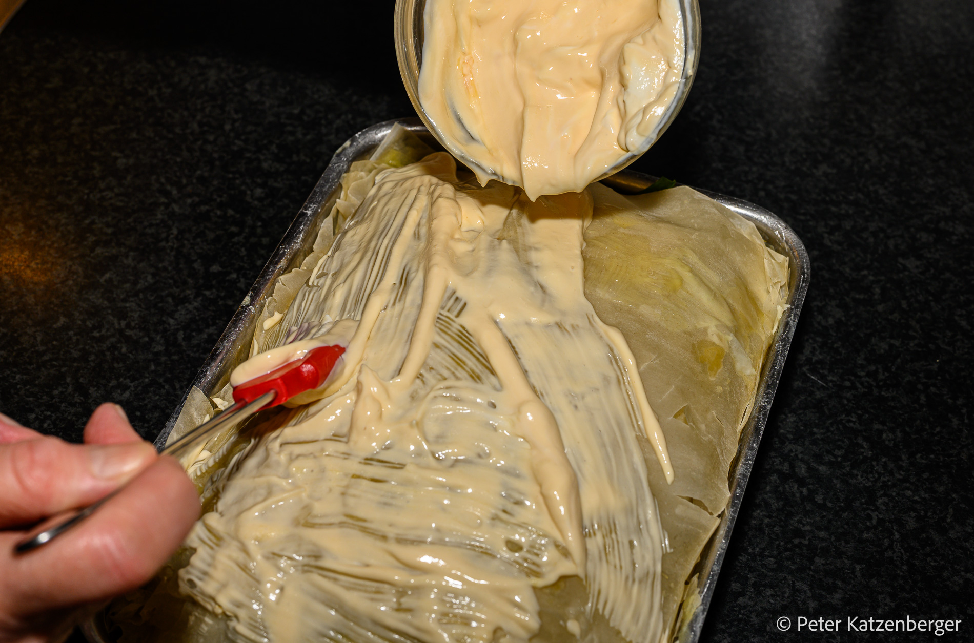- 7 Teigplatten jeweils mit flüssiger Butter bestrichen in die Auflaufform schichten.