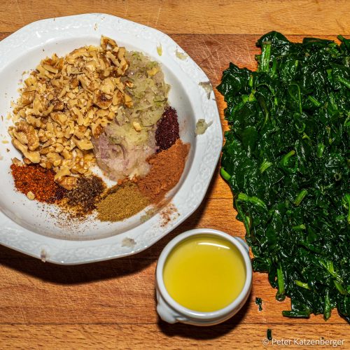 Den blanchierten Spinat grob hacken und mit den Zwiebeln, dem Zitronensaft, den gehackten Walnusskernen vermischen.