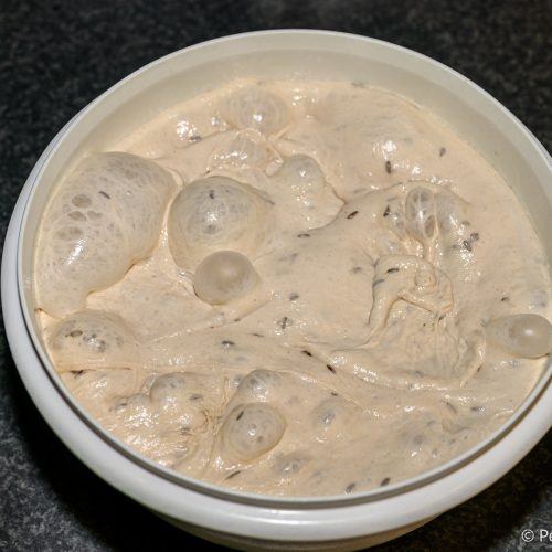 Nun wird der Teig bis zu 24 Stunden fest verschlossen in einer Schüssel in den Kühlschrank gestellt.
