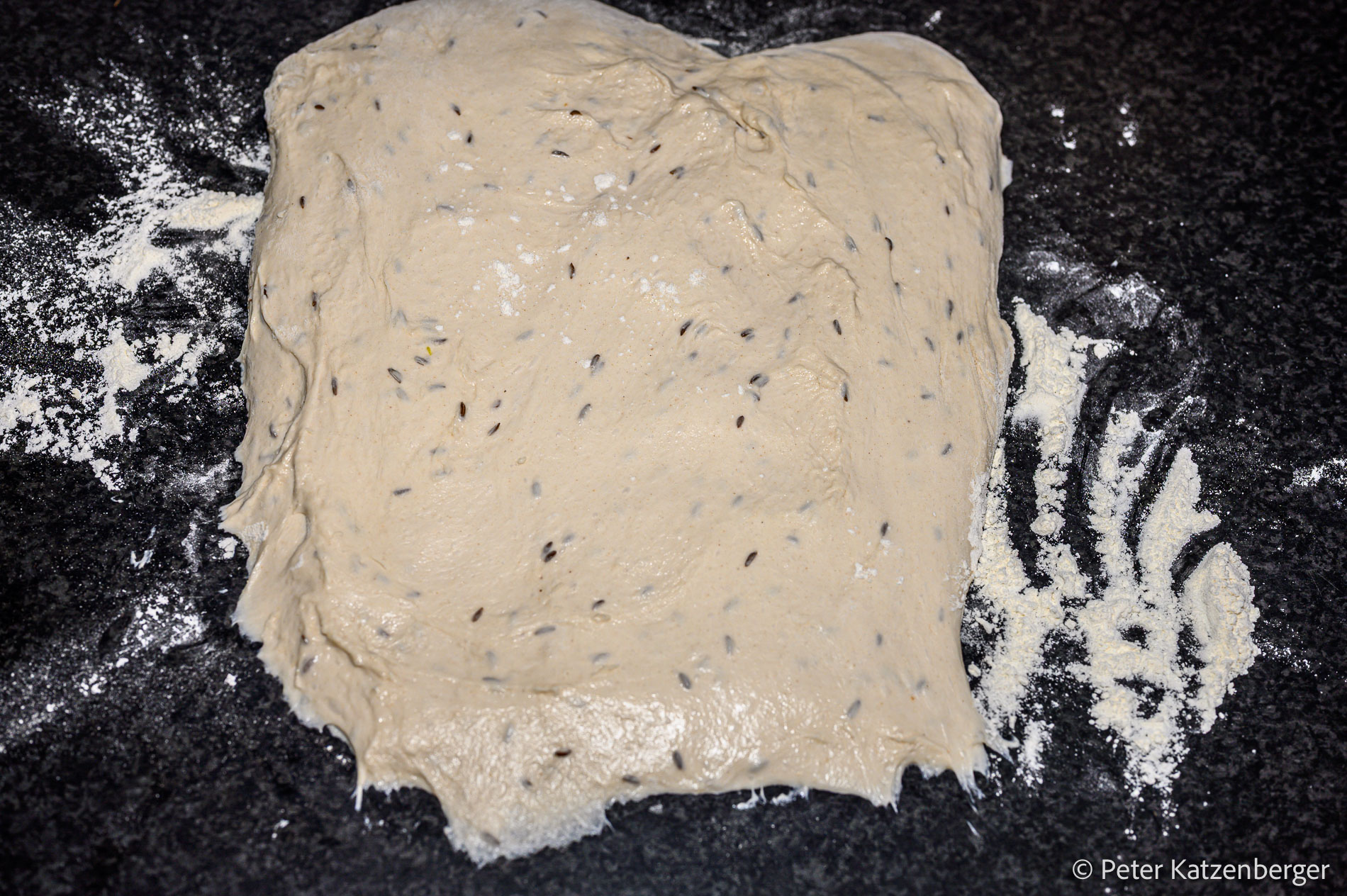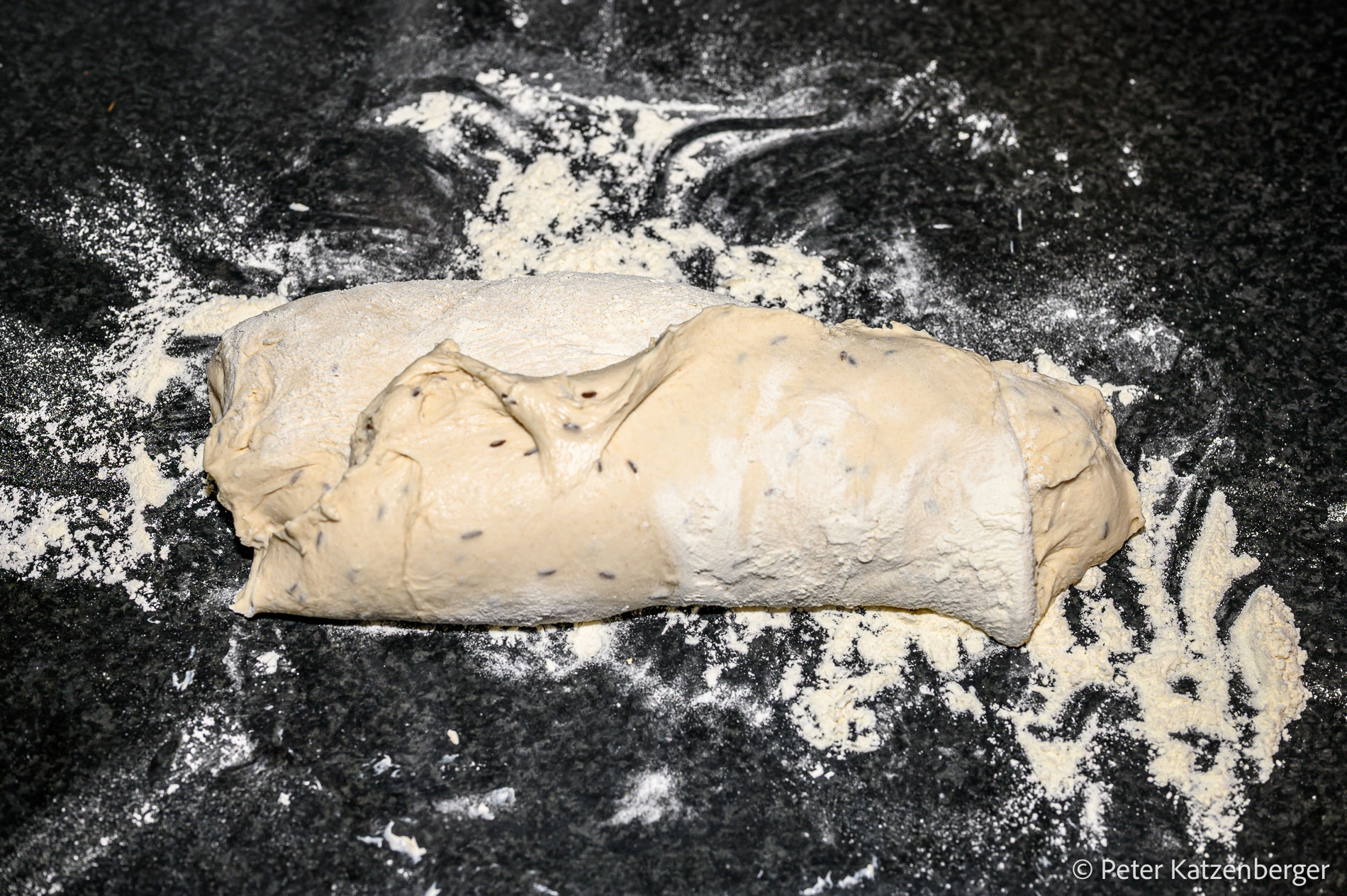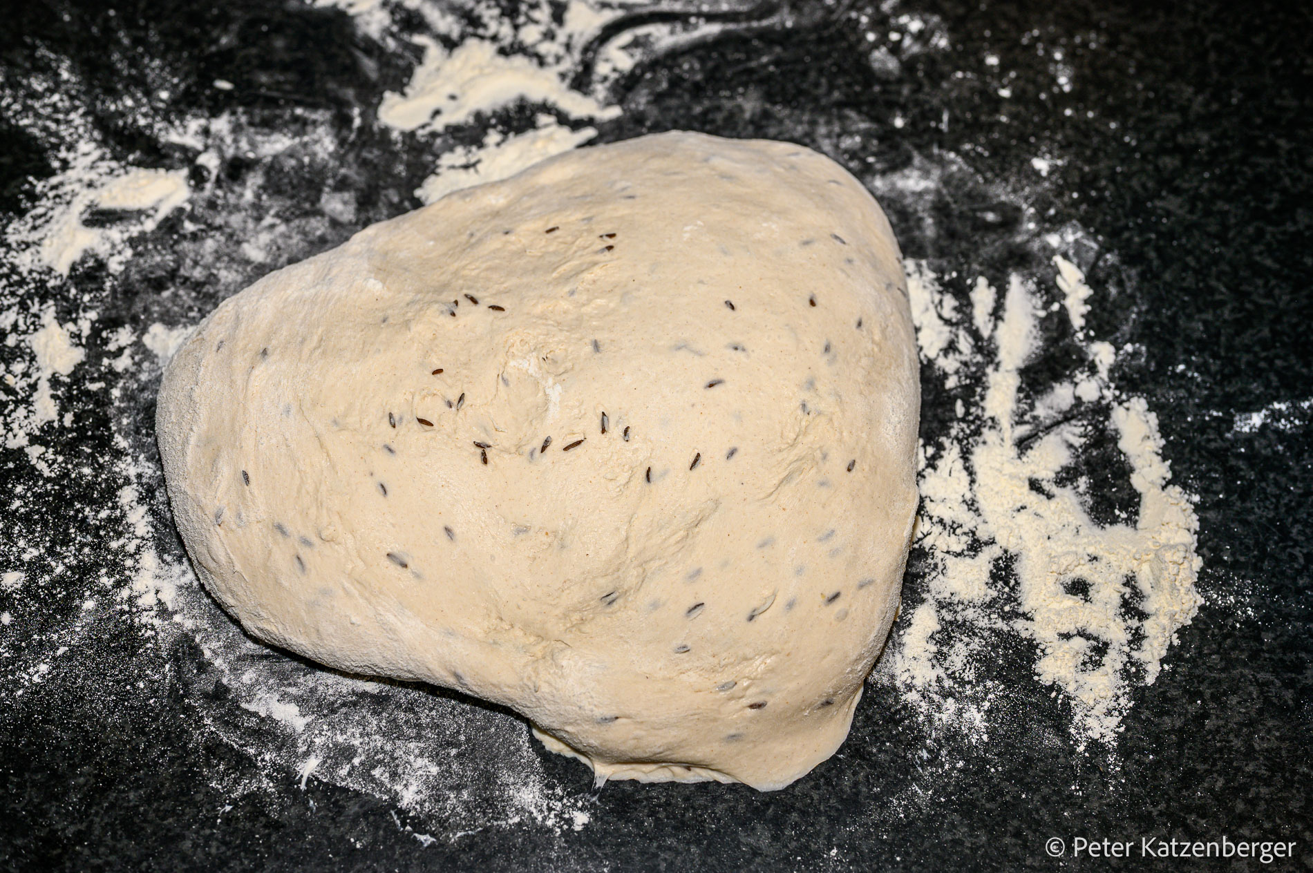 Nach einer halben Stunde gebt ihr die Hefe-Wasser-Mischung zum Hauptteig bei niedriger Geschwindigkeit. Sobald sich die Mischung eingebunden hat, lasst ihr den Teig bei hoher Stufe ca. 5 Minuten kneten. Dann kommt das Salz und Kümmel dazu. Falls der Teig sich nicht vom Schüsselrand lösen sollte, gebt ihr nach und nach bis zu 50 g Mehl hinzu.Erneut wird der Teig nochmals 30 Minuten stehen gelassen. Beim Umfüllen in eine Schüssel mit Deckel faltet ihr den Teig 2-3 Mal.