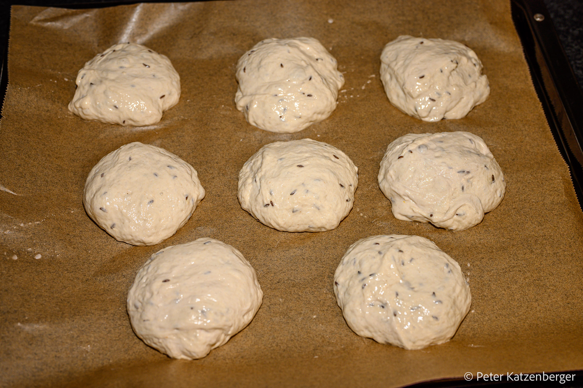 Mit der nassen Hand werden Brötchen geformt, und zwar von allen Seiten zur Mitte nach unten hin. Die Brötchen werden auf ein Backblech mit Backpapier gelegt. Die Brötchen müssen nicht nochmals gehen.