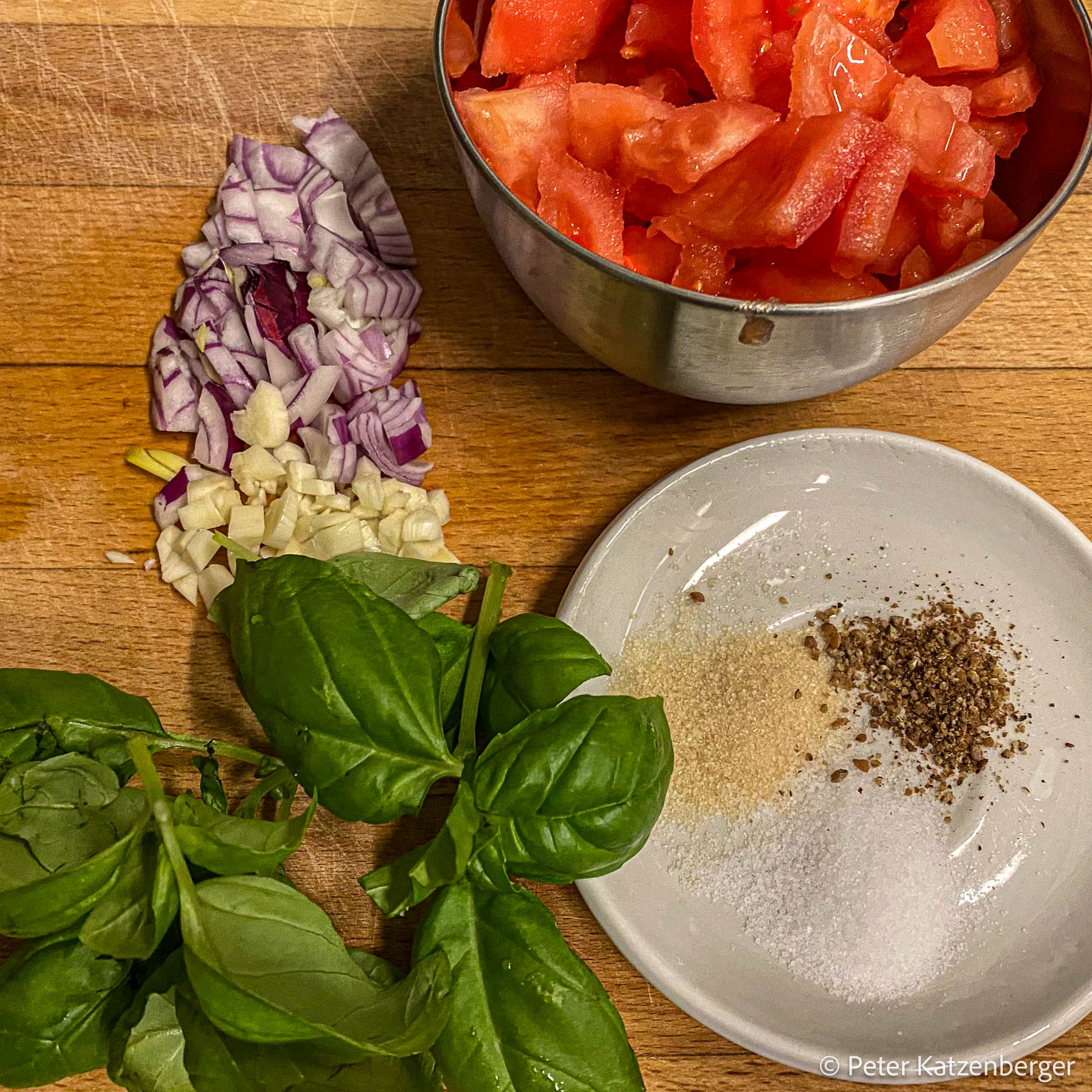 Darauf wird die Tomatensoße, die nochmals mit frischem Basilikum gewürzt wird, verteilt.